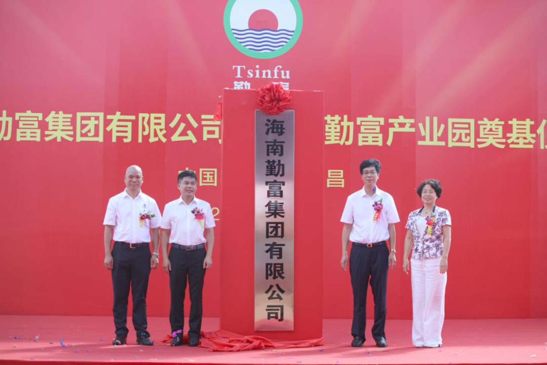 文昌市委书记钟鸣明、省农业农村厅副厅长刘忠松、省工商联专职副主席徐凤、勤富集团董事长周勤富为海南勤富集团有限公司成立揭牌。