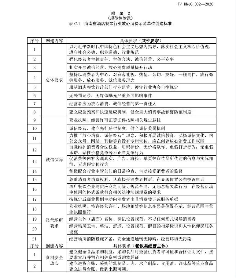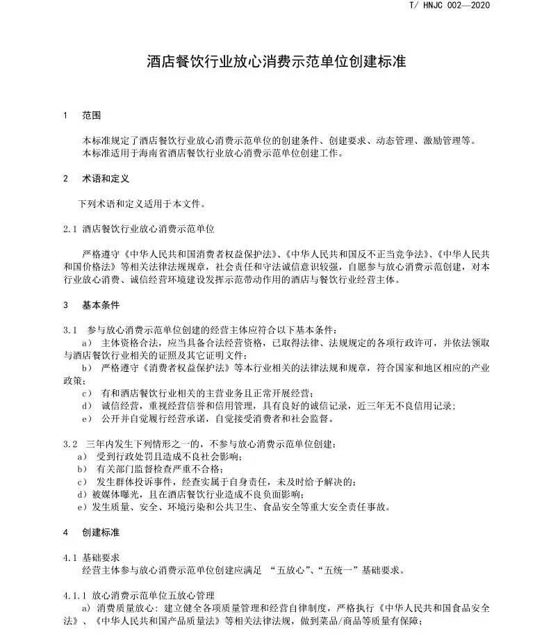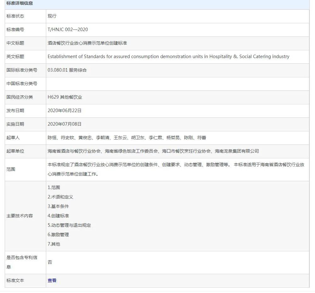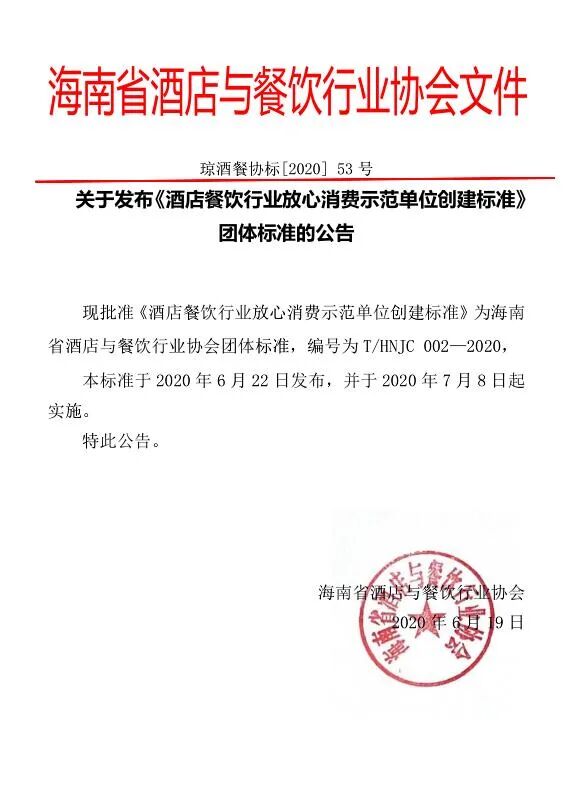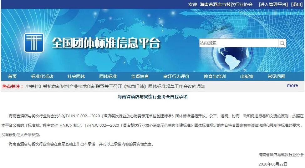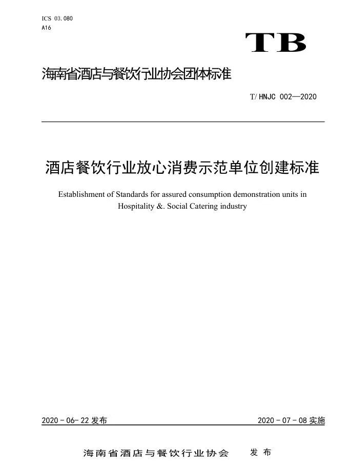 2020年6月22日,海南省酒店与餐饮行业协会(以下简称“协会”)在全国标准信息公共服务平台正式发布《酒店餐饮行业放心消费示范单位创建标准》团体标准。