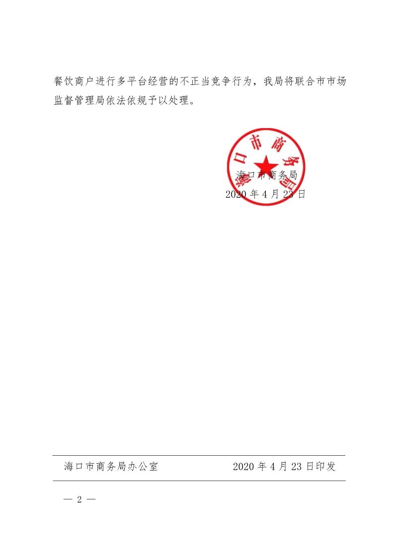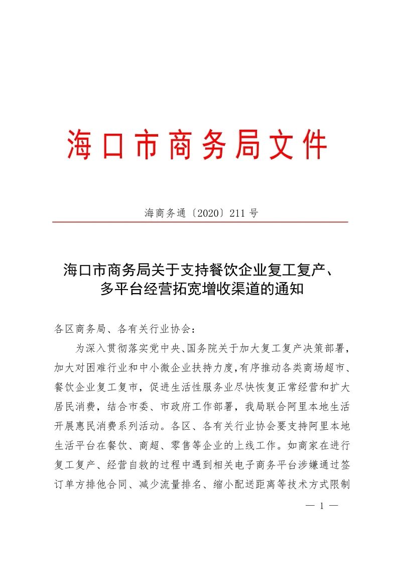 海口市商务局关于支持餐饮企业复工复产、多平台经营拓宽增收渠道的通知
