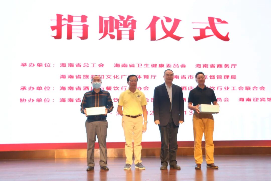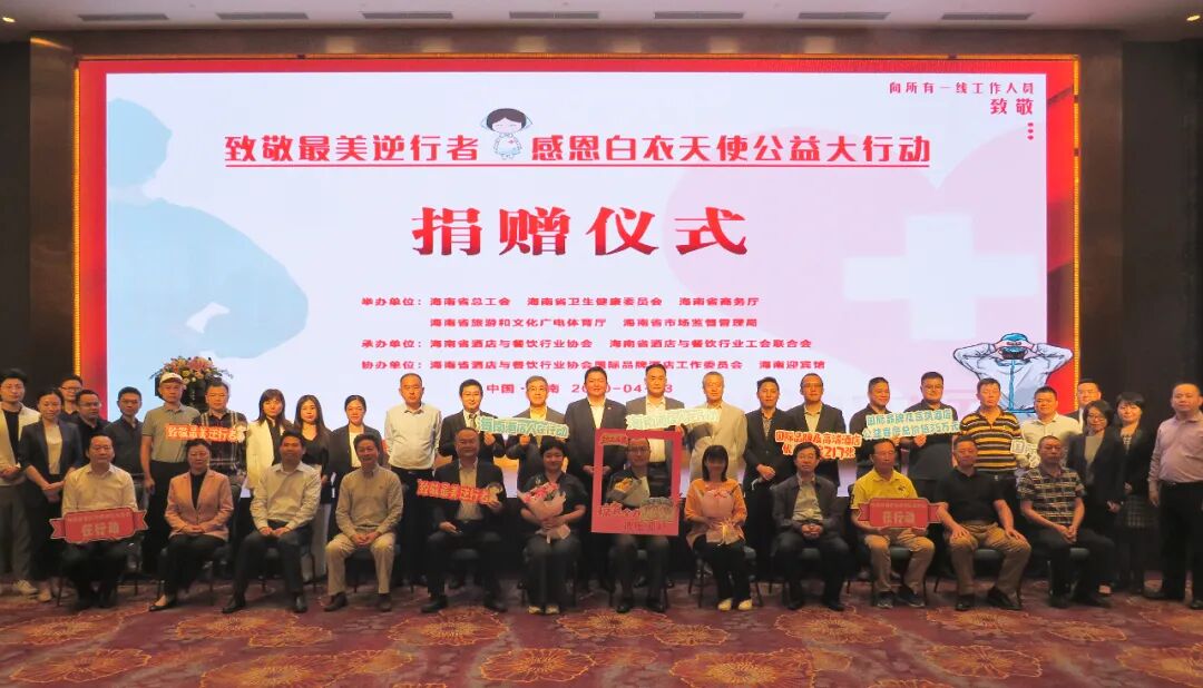 4月13日下午,由省总工会、省卫生健康委员会、省商务厅、省旅游和文化广电体育厅、省市场监督管理局指导,省财贸旅游烟草工会、省酒店与餐饮行业协会、省酒店与餐饮行业工会联合会承办,省酒店与餐饮行业协会国际品牌酒店工作委员会、海南迎宾馆协办的“致敬最美逆行者·感恩白衣天使公益大行动”捐赠仪式圆满举行。省总工会副主席何清,省卫生健康委员会副主任李文秀,省市场监督管理局二级巡视员张绪明,省财贸旅游烟草工会常务副主席韩志光,省卫生健康委员会工会主席张雪松,省商务厅工会主席司哲,省旅游和文化广电体育厅四级调研员杨正龙,省酒店与餐饮行业协会会长、龙泉集团董事长符史钦及援助武汉突出贡献的医护代表、参与捐赠的企业代表、携程海南区总经理和主流媒体代表等出席捐赠仪式,捐赠仪式由省酒店与餐饮行业协会陈恒执行会长主持。