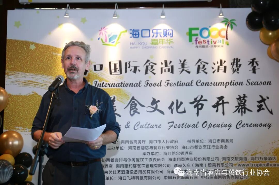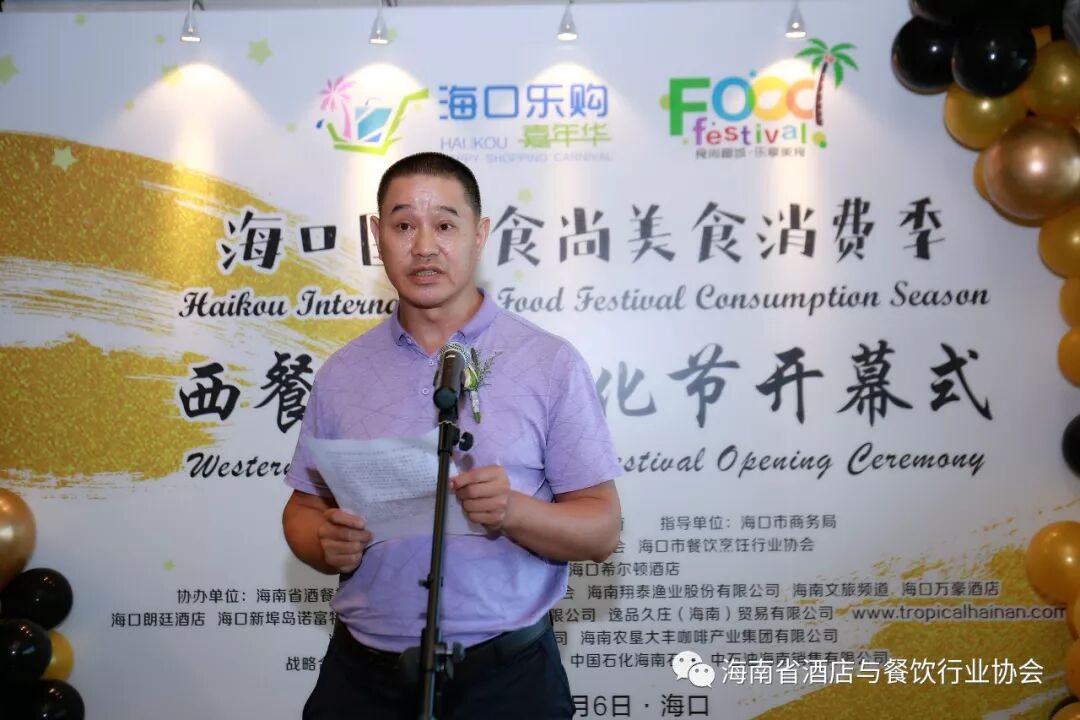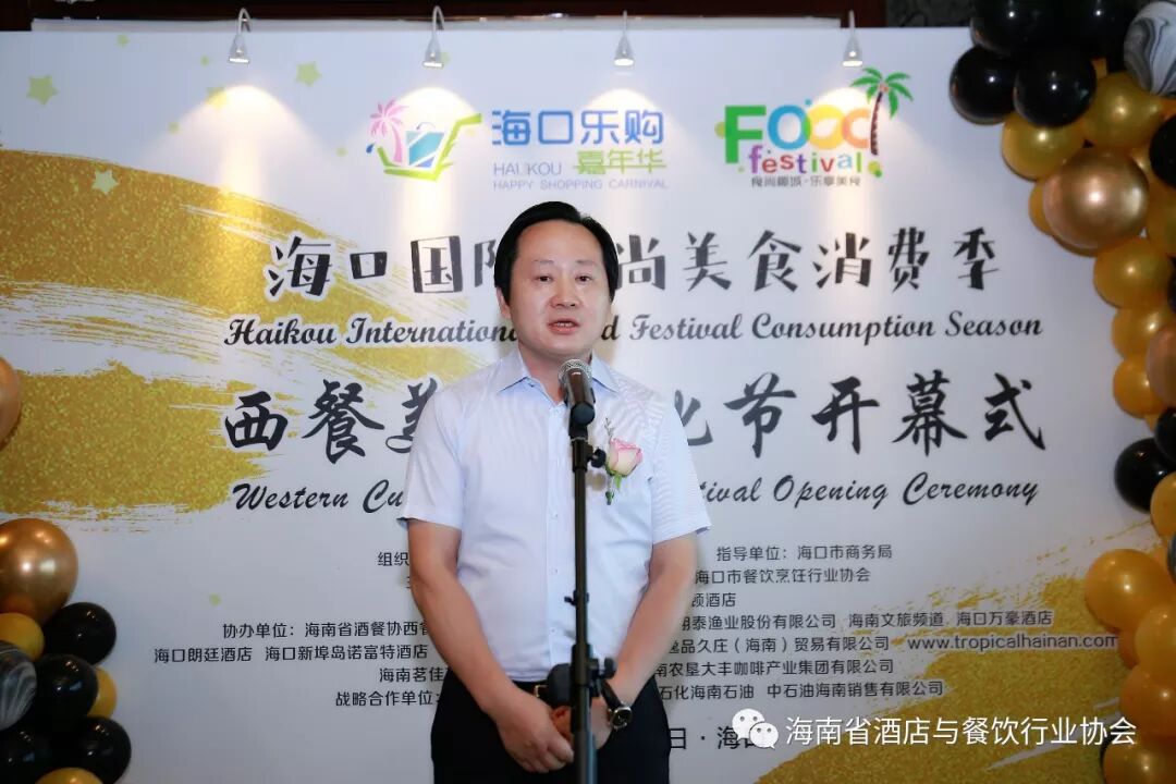 8月6日,由海南省商务厅、海口市人民政府组织,海口市商务局指导,海南省酒店与餐饮行业协会、海口市餐饮烹饪协会主办的海口国际食尚美食消费季活动之一西餐美食文化节盛大开幕。海南省商务厅消费促进处调研员谢国安,海南省服务贸易促进局调研员吕志辉,海口市商务局副调研员陆宾林,海口市商务局流通科负责人赵军,中国饭店协会副监事长、海南省酒店与餐饮行业协会执行会长陈恒,海南省酒店与餐饮行业协会监事长、荷泰投资发展有限公司董事长李朝清,海南省酒店与餐饮行业协会副会长——海口希尔顿酒店总经理刘志成、海口香格里拉大酒店总经理沈霆、海南鸿洲埃德瑞皇家园林酒店总经理黄波、百胜餐饮(深圳)有限公司海南分公司公共事务部负责人李明月、海南豪约客餐饮管理有限公司总经理桑圣青、海南茗佳茗酒店设备用品有限公司总经理李业鹏、海南甬和久庄文化有限公司董事长胡晓君、协会秘书长陈刚,海南省酒店与餐饮行业协会副监事长、海南君华海逸酒店总经理方权,海南省酒店与餐饮行业协会特邀顾问、海口飞特网总经理张炜,特邀嘉宾——热带海南英文网(TROPICAL HAINAN) 创始人 Patrick Quinn,参与西餐美食文化节的外籍酒店业主、负责人,酒店与餐饮企业相关负责人,以及社会各界来宾、消费者代表、媒体负责人近200人参加。
