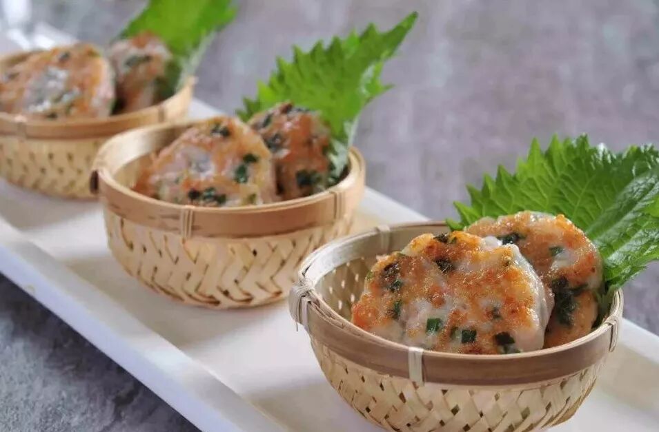捞叶学名假蒟,是胡椒科植物,海南人因其叶有芬芳气味常用于日常家庭烹饪调味,此叶理气舒心有食疗功效。鱼饼精选海南鲜鱼手工调制,配以捞叶的清爽芬芳,极富海南特色。