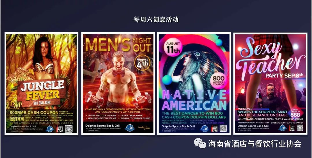 SPORT、LIVE、PARTY、FOOD、DRINK是海豚餐吧的关键词,与其他餐吧更具有竞争力的地方莫过于,这里除了有劲爆的体育赛事直播以及现场的ROCK LIVE BAND每天点燃大家的热情,每周六推出不同的主题派对更是将娱乐推向高潮。