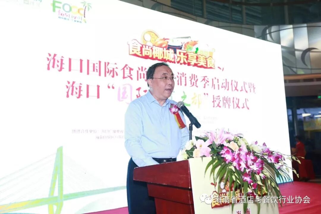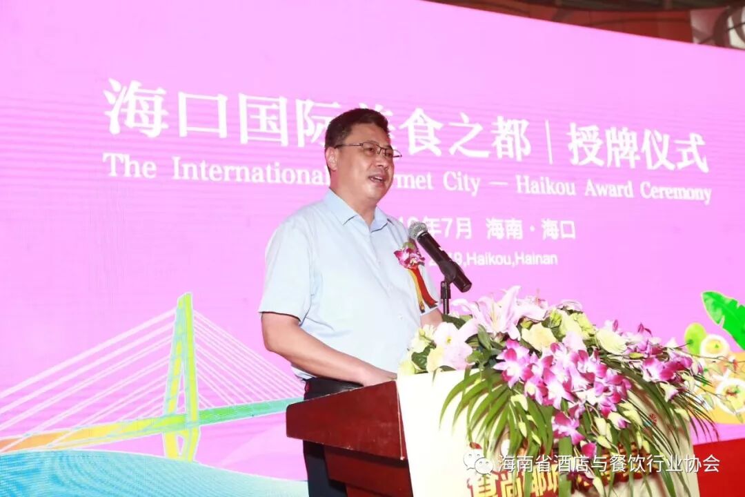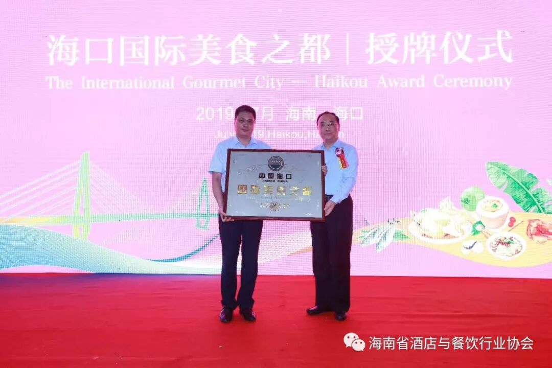 世界中餐业联合会常务副会长邢颖为海口市副市长王磊授予海口“国际美食之都”称号牌匾