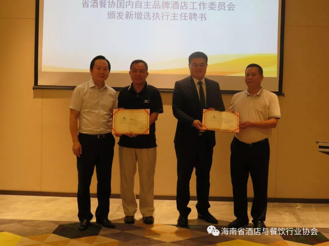 会议上,与会代表提议将“国内自主品牌酒店工作委员会”更名为“民族品牌酒店分会”,经举手表决赞同,省酒餐协分支机构“国内自主品牌酒店工作委员会”现更名为“民族品牌酒店分会”,同时为海南蓝海钧华大饭店李玉柱总经理颁发执行主任证书、为三亚中亚国际大酒店陈海坚总经理颁发副主任证书。