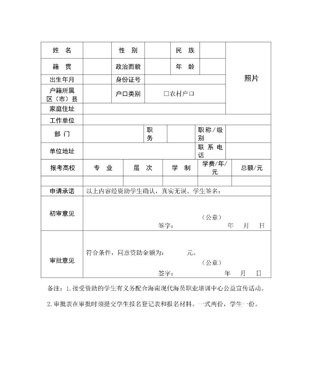 海南省2019年“教育扶贫·助学扶智-阳光工程”申请审批表(全额资助)