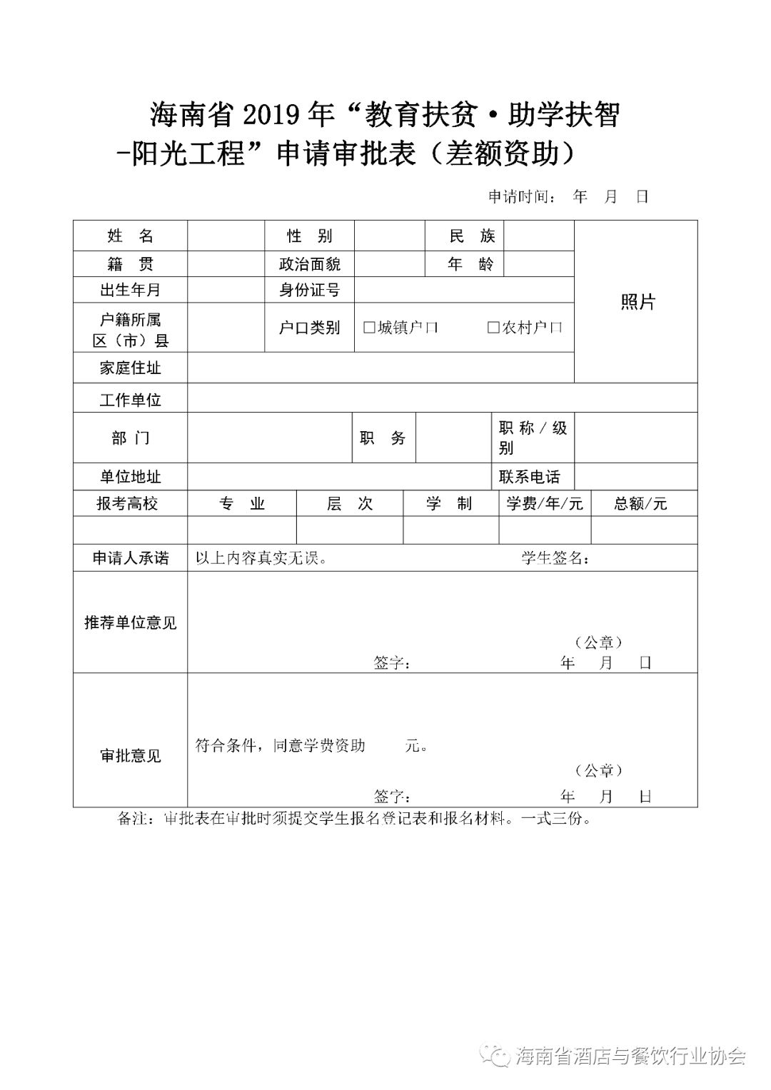 海南省2019年“教育扶贫·助学扶智-阳光工程”申请审批表(差额资助)