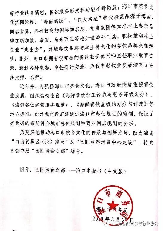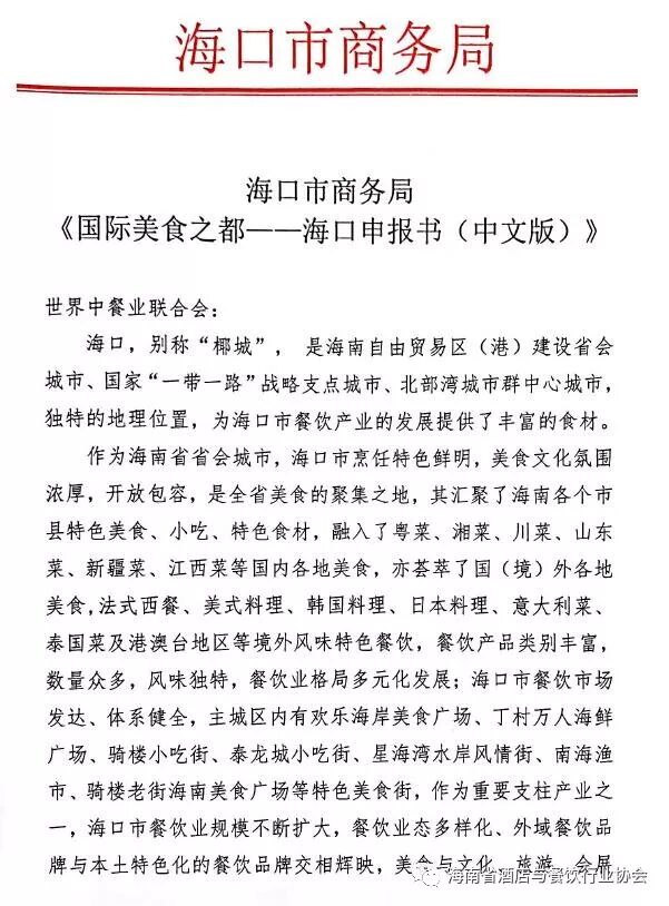 为更好地推动海口市饮食文化的传承与创新发展,培育、创建“国际美食之都”,海口市政府高度重视相关工作开展,在历时近半年的时间里,由海口市政府指导,海口市商务局在海南省酒店与餐饮行业协会和海口市餐饮烹饪协会的协助下,在开展实地调研与专家咨询的基础上,草拟并完善《国际美食之都——海口申报书(中文版)》。随后的4天,专家考察组一行将根据申报书具体申报情况,考察海南技师学院等烹饪专业院校,赴海南省博物馆、水巷口海南美食文化博览城等考察海口市历史文化,前往友谊阳光城、观澜湖新城等考察我市国际休闲美食街区,赴海垦夜市体察海口夜市文化,前往海鲜大世界及火车头万人海鲜广场考察海口海鲜食材市场,及赴海南龙泉集团、欢乐海岸美食联盟、琼菜王、海南大院、华诚汇酒家、海南君华海逸酒店、皇马假日游艇度假酒店等大型特色酒店餐饮企业开展考察。