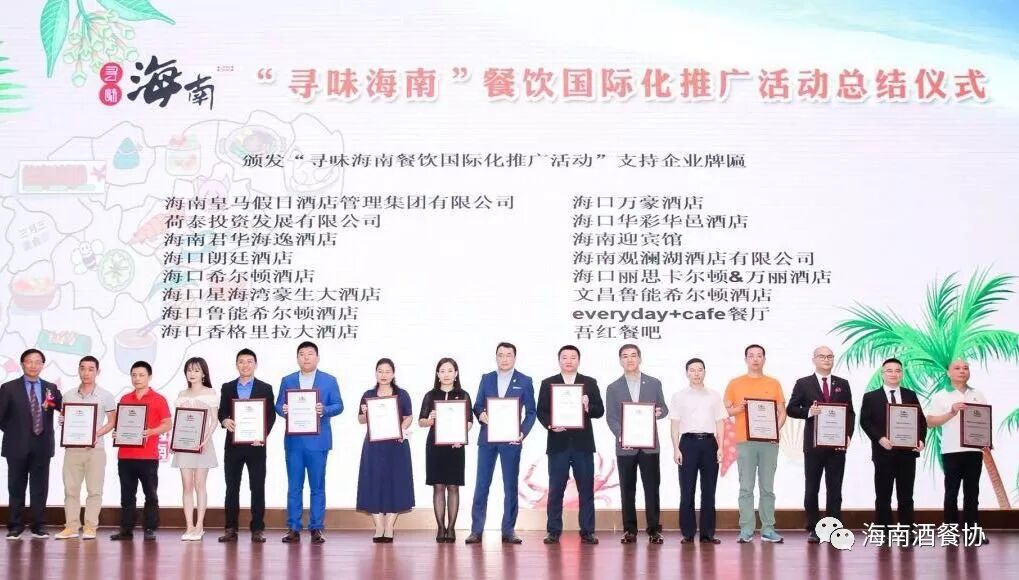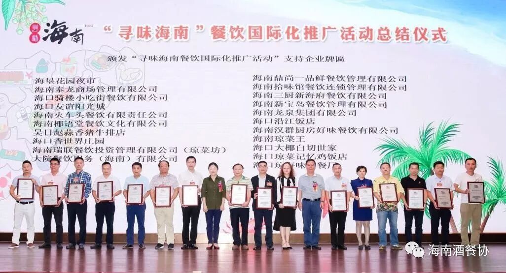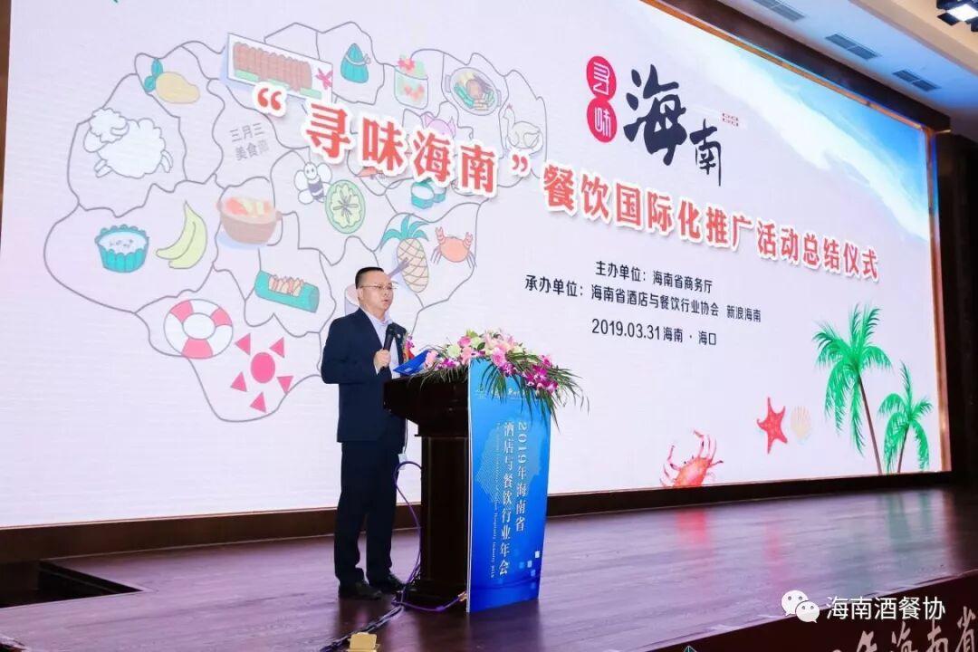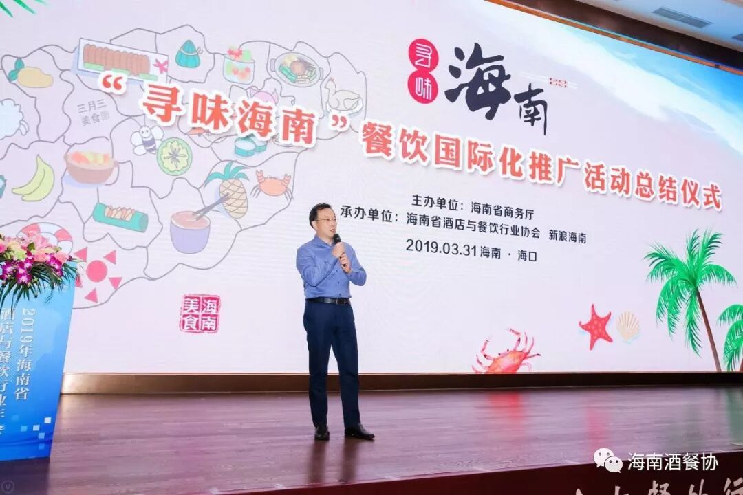 由海南省商务厅主办,海南省酒店与餐饮行业协会和新浪海南联合承办的“寻味海南”餐饮国际化推广活动(第一季“疯味海澄文”)自去年11月底启动,经过4个月的不间断推介日前已完美收官。2019年3月31日下午,“寻味海南”餐饮国际化推广活动总结仪式于海南迎宾馆召开,海南省服务贸易促进局、海南省酒店与餐饮行业协会、新浪海南,我省知名商场(美食街、夜市)餐饮企业、社会餐饮(酒楼、海鲜)企业、宾馆(星级酒店)餐厅负责人,以及相关中央驻琼媒体、省市知名媒体记者代表约600余人参加。