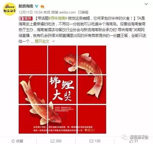 不仅如此,“寻味海南”活动全城寻找“海南锦鲤”,集合直播企业提供的累计60余份霸王餐、消费券以及酒店房券,价值近万元的“锦鲤大奖”只送一人,引发全海南吃货的“强烈围观”。同时,活动就直播餐饮商家以及省内具有代表性的美食商家,以“宴”为名,以美食为媒,推出36道海南特色“琼味家宴”,展琼味精华;此外,活动推出3集“寻味海南”系列美食(中英文字幕)纪录片,整合荟萃海澄文地区美食精华,打造海南独特的美食外宣名片,助推“寻味海南”国际化。