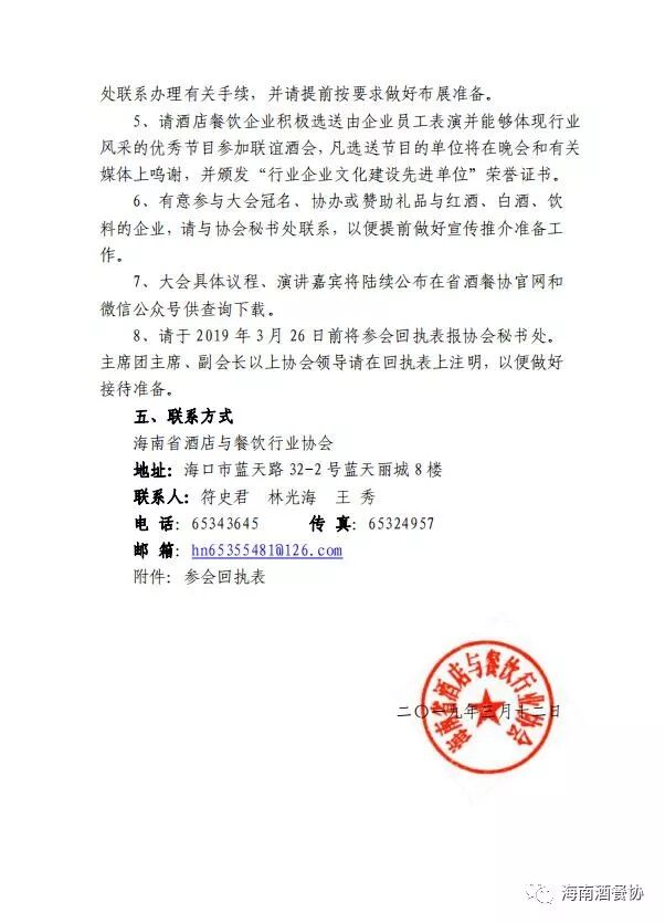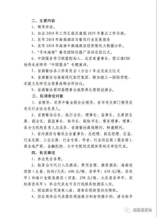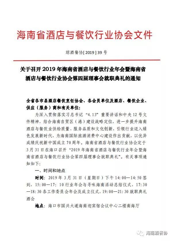 关于召开2019年海南省酒店与餐饮行业年会暨海南省酒店与餐饮行业协会第四届理事会就职典礼的通知