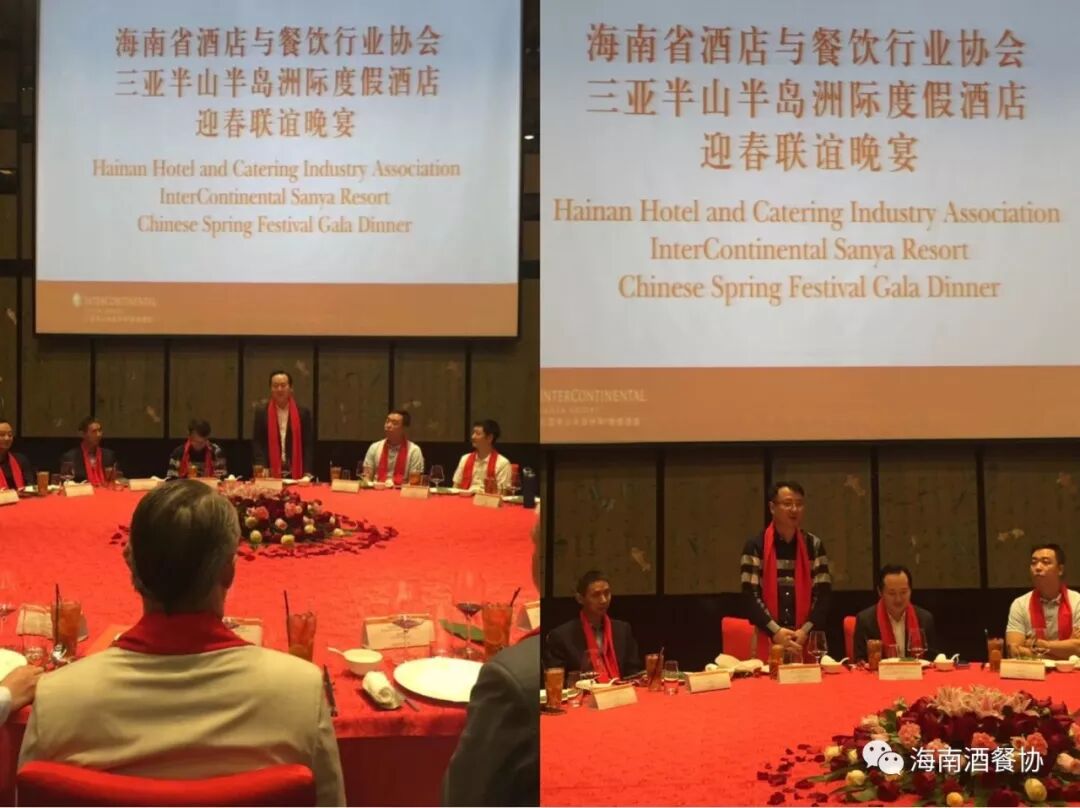 迎春联谊晚宴上,首先由三亚半山半岛洲际度假酒店业主代表苗总代表酒店对各位同仁的到来表示了热烈的欢迎,苗总讲述了近来酒店行业的发展概况,同时将个人在酒店行业多年积累的丰富管理经验进行分享。其次,省酒餐协执行会长陈恒代表协会对各位总经理在百忙之中拨冗参加此次迎春联谊晚宴表示感谢,向酒店业的管理人员及从业人员致以节日慰问和祝福,并概述了酒店业在过去一年与当下面临的困难与新挑战、新机遇,以及表达了行业协会期待聆听各大酒店的宝贵建议,将更好地做好协会服务工作,致力于将行业的发展建设更上一层楼。与此同时,参加晚宴的二十多家国际国内品牌酒店总经理(含外籍总经理)和业主代表在当下市场新形势的背景下,对春节预订房态、旅游市场的情况进行了讨论,以及纷纷交流应对春节旺季如何做好接待服务的经验。