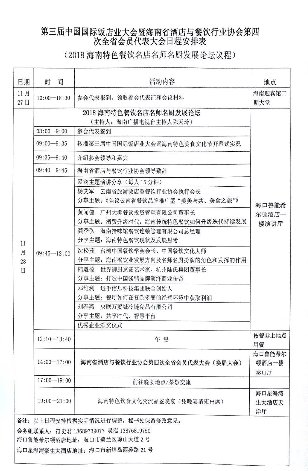 经海南省人民政府批准,由国际饭店与餐馆协会、海口市人民政府和全国绿色饭店工作委员会支持,中国饭店协会、海南省商务厅、海南省总工会决定将于11月27-30在海南省海口市举办“第三届中国国际饭店业大会暨海南特色美食文化节”(以下简称“大会”)。期间召开“2018海南省特色餐饮名店名师名厨发展论坛”,邀请省内外特色餐饮名店代表探讨如何在餐饮行业打造“一店一品”品牌,以及在“国际旅游消费中心”建设的大背景下,如何更好地推动海南特色餐饮发展。