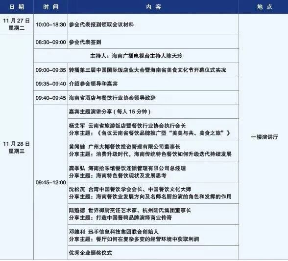 经海南省人民政府批准,由国际饭店与餐馆协会、海口市人民政府和全国绿色饭店工作委员会支持,中国饭店协会、海南省商务厅、海南省总工会决定将于11月27-30在海南省海口市举办“第三届中国国际饭店业大会暨海南特色美食文化节”(以下简称“大会”)。期间召开“2018海南省特色餐饮名店名师名厨发展论坛”,邀请省内外特色餐饮名店代表探讨如何在餐饮行业打造“一店一品”品牌,以及在“国际旅游消费中心”建设的大背景下,如何更好地推动海南特色餐饮发展。