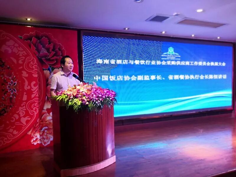 2018年10月19日下午,省酒店与餐饮行业协会采购供应商工作委员会换届大会在海口龙泉花园酒店召开。出席会议的嘉宾有中国饭店协会副监事长、省酒餐协执行会长陈恒,省酒餐协主席团主席:海南金海酒店用品城发展有限公司董事长黄文奕(第一届采供委执行主席)、海南喜路来服饰有限公司总经理谭理仁(第一届采供委副主席)、海南博美环保水电工程有限公司总经理朱禹旭(第一届采供委副主席)、海南新意农业旅游开发有限公司总经理吕庆臣,省酒餐协副会长:海南久之美酒业有限公司总经理高莉(第一届采供委副主席)、海南顺腾贸易有限公司总经理刘晋玮、海南龙健畜牧开发有限公司总经理李龙生、海南道灶堂马袅海鸭产业有限公司董事长刘胜利、海南德厚昌商贸有限公司总经理王晓添、海南中东机电安装工程有限公司总经理易文广、海南鑫思卡尔商贸有限公司总经理何国文、文昌海天花园酒家总经理张玉莲、海南海德堡酒店管理有限公司董事傅维辉,省酒餐协副会长兼秘书长陈刚,海口南北批发市场有限公司、海口伟德牧业有限公司董事长胡凤桔,海南晟发行食品贸易有限公司董事长王邦发,海南皇马假日酒店管理有限公司采购总监梁伟忠,龙泉集团采购中心总经理孙彤,省内外优秀产业链上下游相关供应(服务)商及酒店与餐饮采购负责人等120余人参加会议。