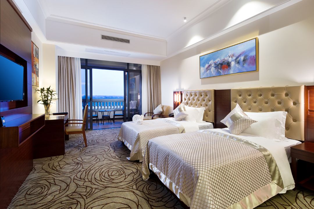 酒店分别有尊尚房、花园房、池畔江景房、庄园红酒房、庄园红酒套房、庄园红酒双卧套等六种房型,房间内部装饰为简约欧式风格,温馨高雅,突出艺术性与文化氛围,彰显五星级酒店的尊贵与豪华。酒店设施齐全,提供商务网络、数字互动电视、可控空调及舒适的床上用品,足够解除您一天的旅途疲劳。