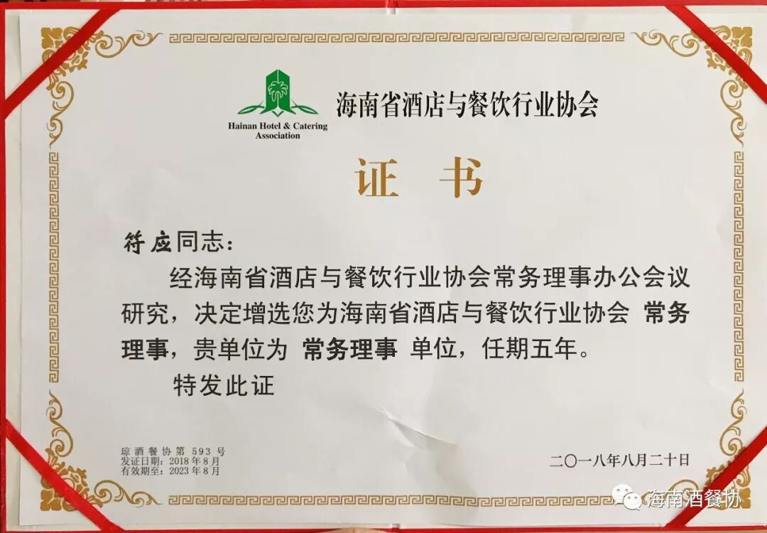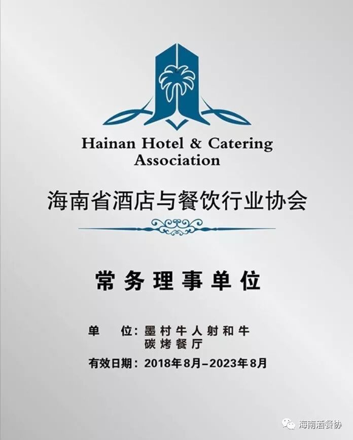经海南省酒店与餐饮行业协会常务理事会议研究决定,将墨村牛人射和牛碳烤餐厅增选为第三届常务理事单位,同时授予牌匾及证书。