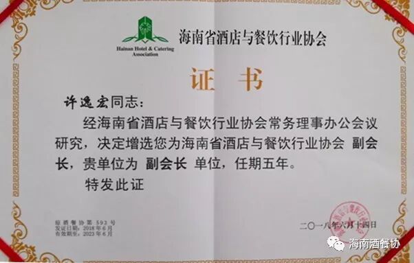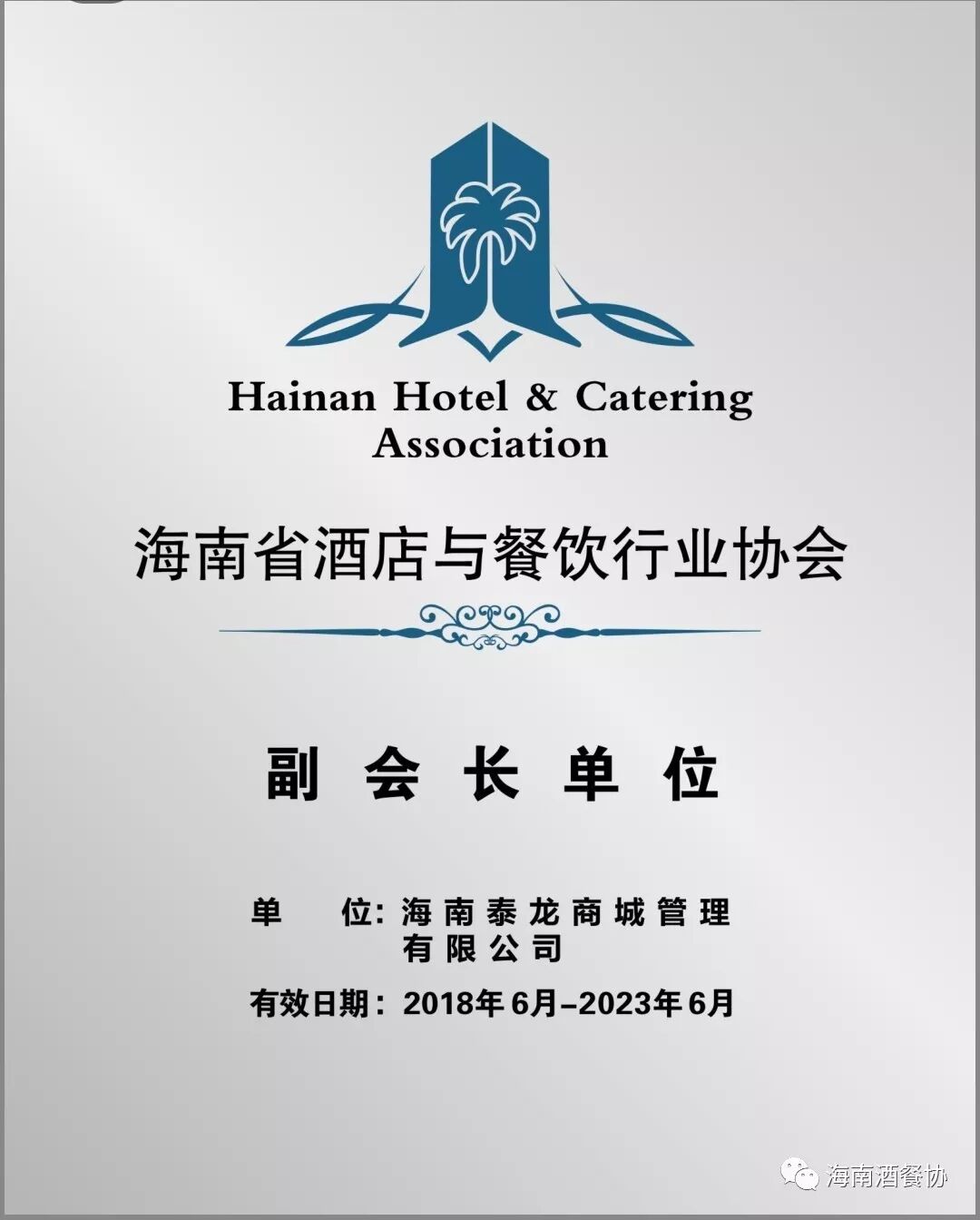经海南省酒店与餐饮行业协会常务理事会议研究决定,将海南泰龙商城管理有限公司增选为第三届副会长单位,同时授予牌匾及证书。