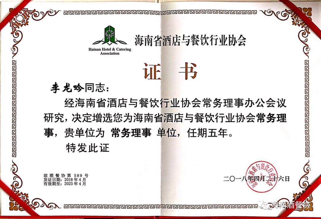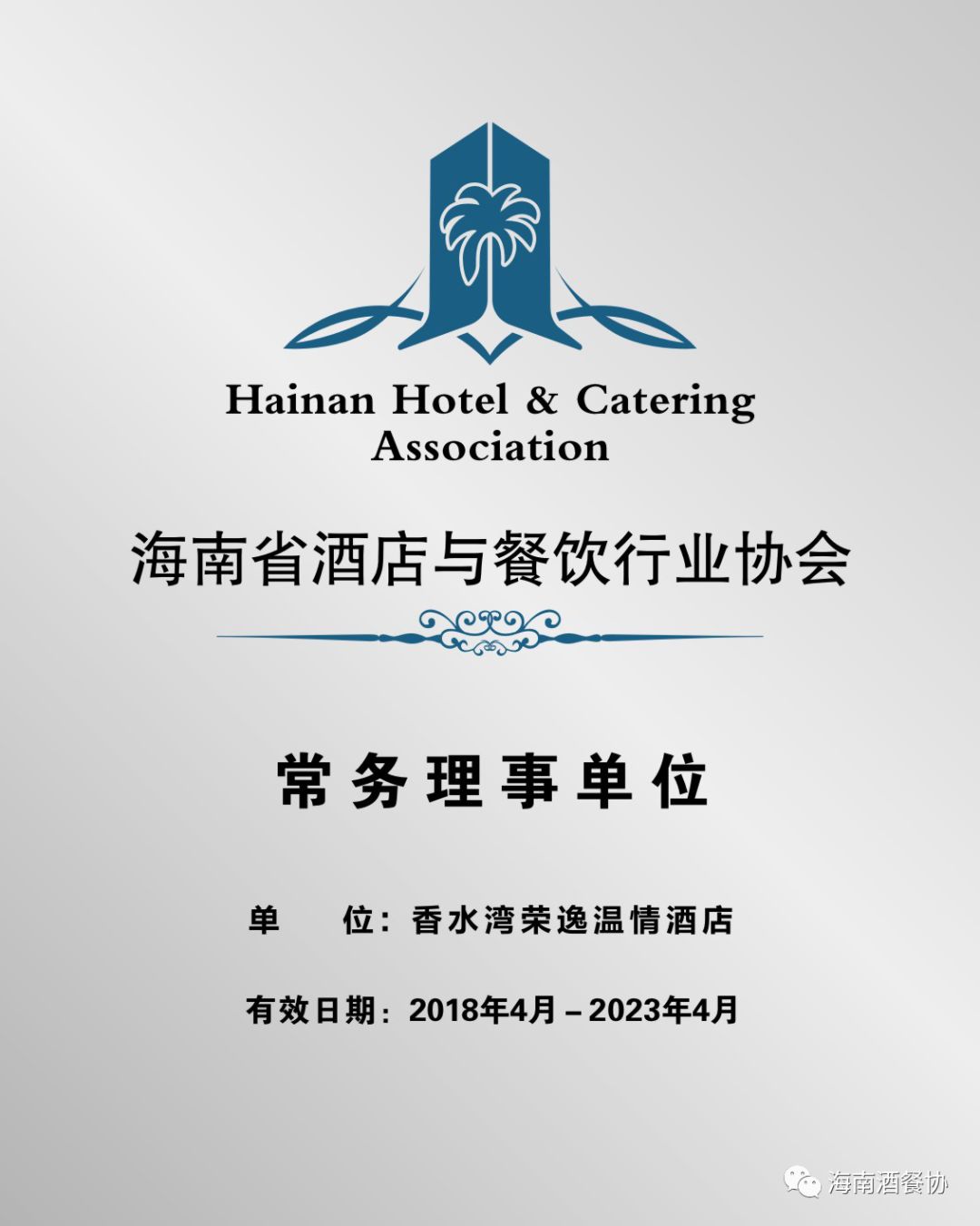 经海南省酒店与餐饮行业协会常务理事会议研究决定,将三亚香水湾荣逸温情酒店增选为第三届常务理事单位,同时授予牌匾及证书。