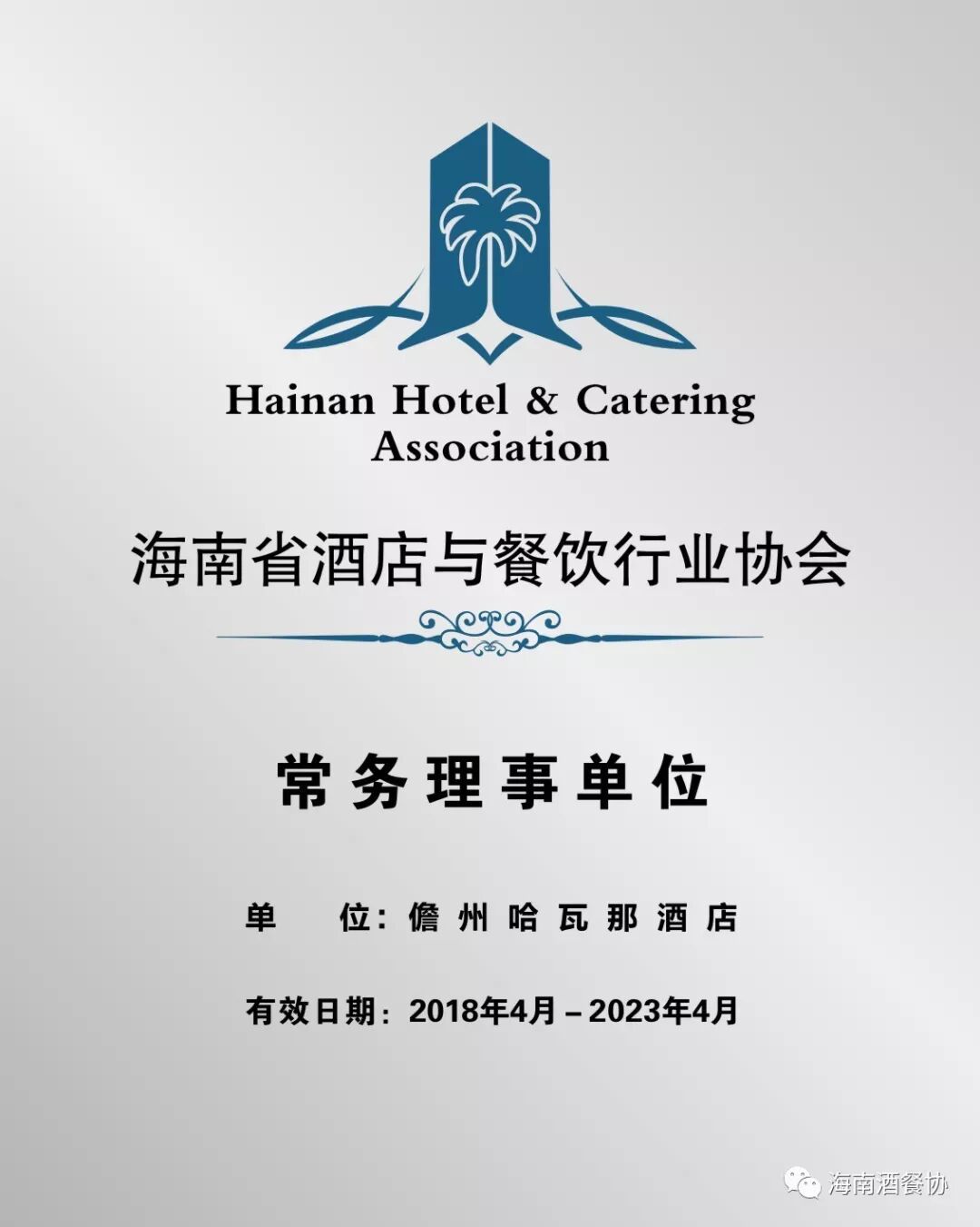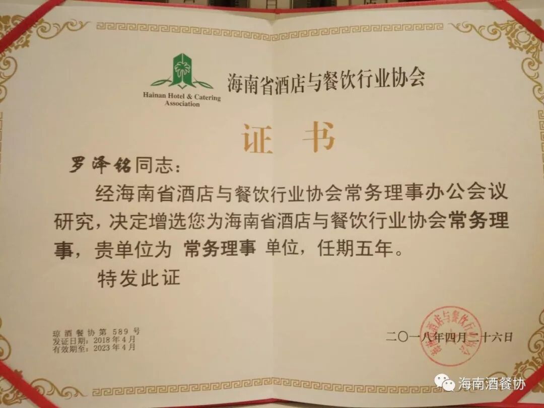 经海南省酒店与餐饮行业协会常务理事会议研究决定,将碧桂园哈瓦那假日酒店增选为第三届常务理事单位,同时授予牌匾及证书。