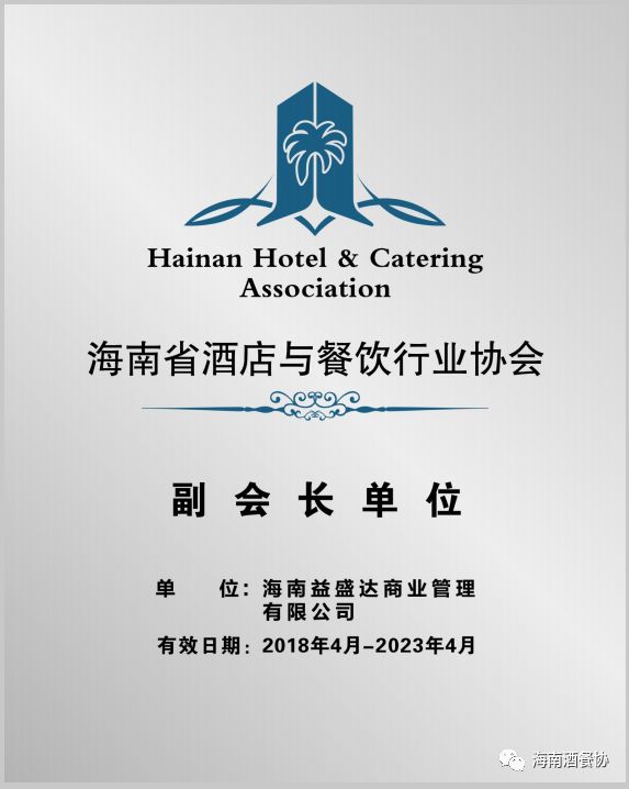 经海南省酒店与餐饮行业协会会议研究决定,将海南益盛达商业管理有限公司增选为第三届理事会副会长单位,同时授予牌匾及证书。