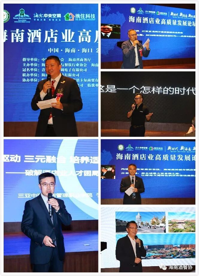 酒店业高质量发展论坛由希尔顿海南北区区域总经理、海口鲁能希尔顿酒店总经理孙金鹏主持,三亚中瑞酒店管理职业学院执行院长于世春以“供给驱动、双元融合,培养适销对路人才”作主题分享,三亚亚龙湾万豪度假酒店总经理高锦洪以“2018海南酒店业新时代——机遇与挑战并存”作主题分享,携住科技三亚分公司总经理张廷利以“未来酒店——智慧酒店”作主题分享,海南森林客栈、海南森林城市酒店董事长 冯清雄 以“借全球最大贸易港之势,让海南主题特色酒店和客栈逢勃发展”作主题分享,恒大酒店管理集团、海花岛酒店群区域总经理关铁山以“浅论新时代背景下的民族品牌酒店发展趋势”作主题分享。