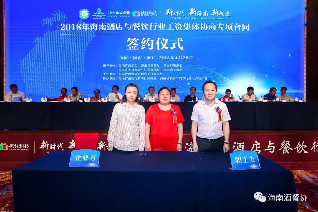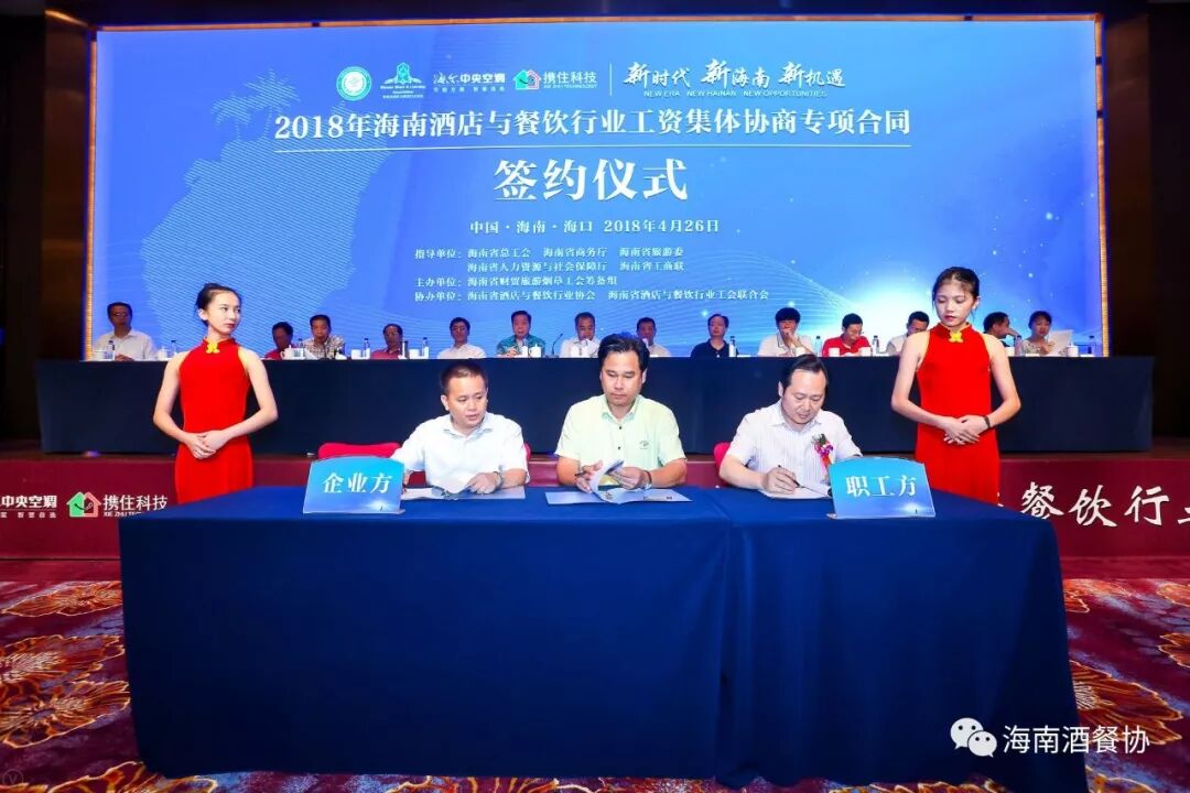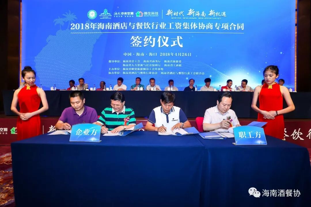 海南省酒店餐饮行业工会联合会与代表全省酒店与餐饮行业工资集体协商职工方,海口市餐饮烹饪行业协会、三亚烹饪餐饮行业协会代表一类地区企业方,儋州市餐饮烹饪协会、琼海市旅游协会餐饮分会代表二类地区企业方,五指山旅游烹饪协会、东方市旅游酒店与餐饮行业协会、万宁市烹饪餐饮行业协会代表三类地区企业方,双方代表正式在2018-2019年行业工资专项集体合同书上签字。此举为企业稳定人才队伍、维护和谐劳动关系奠定扎实的基础,为我省酒店与餐饮行业的健康快速发展和新时期海南全面深化改革开放提供和谐劳动关系保障。