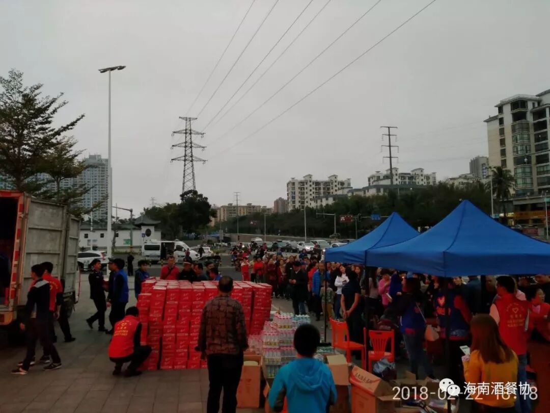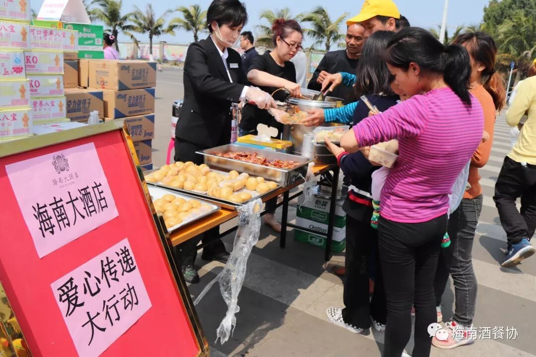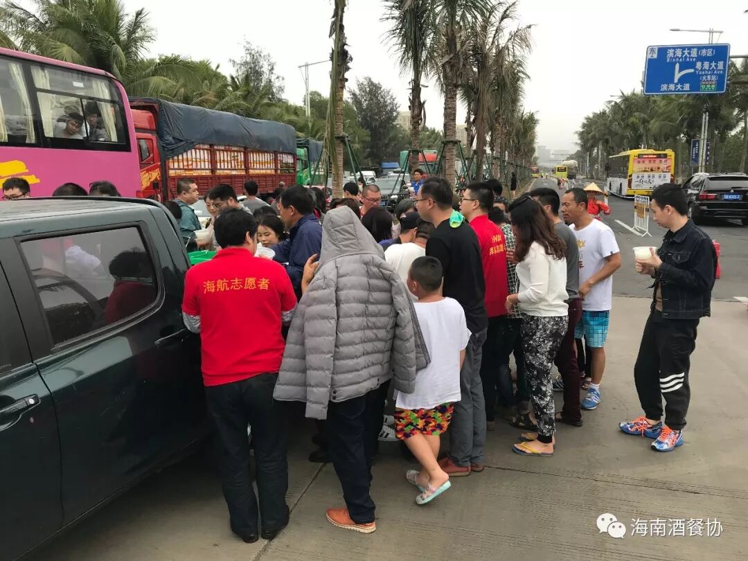 海南迎宾馆每天提供800份爱心套餐,海南三厨新海府餐饮有限公司新增提供1500份爱心粥、油条和800份盒饭,海南莲生餐饮文化管理有限公司(十八碗蒸菜馆)提供3500份套餐饭,海南天涯餐饮管理有限公司提供肉包子1000个,矿泉水20箱,海南大酒店提供免费早餐650份、午餐950份、矿泉水1200瓶,九龙温泉度假酒店提供1500份馒头、热狗、茶叶蛋及矿泉水,天艺酒店集团提供爱心午餐1000份、晚餐750份、矿泉水1800瓶,海口火车头万人海鲜广场提供2000箱八宝粥及矿泉水,秦淮人家酒楼免费为滞留提供热水、充电服务及卫生间服务,尽力为滞留的旅客提供便利及温暖。