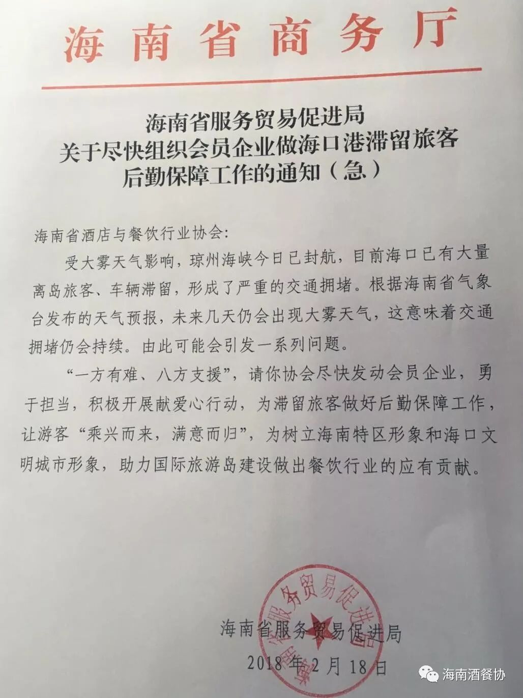 据《海南日报》2月26日讯,近日,为做好滞留旅客的服务工作,省商务厅服务贸易局日前下发“关于尽快组织会员企业做好海口港滞留旅客后勤保障工作的通知”。