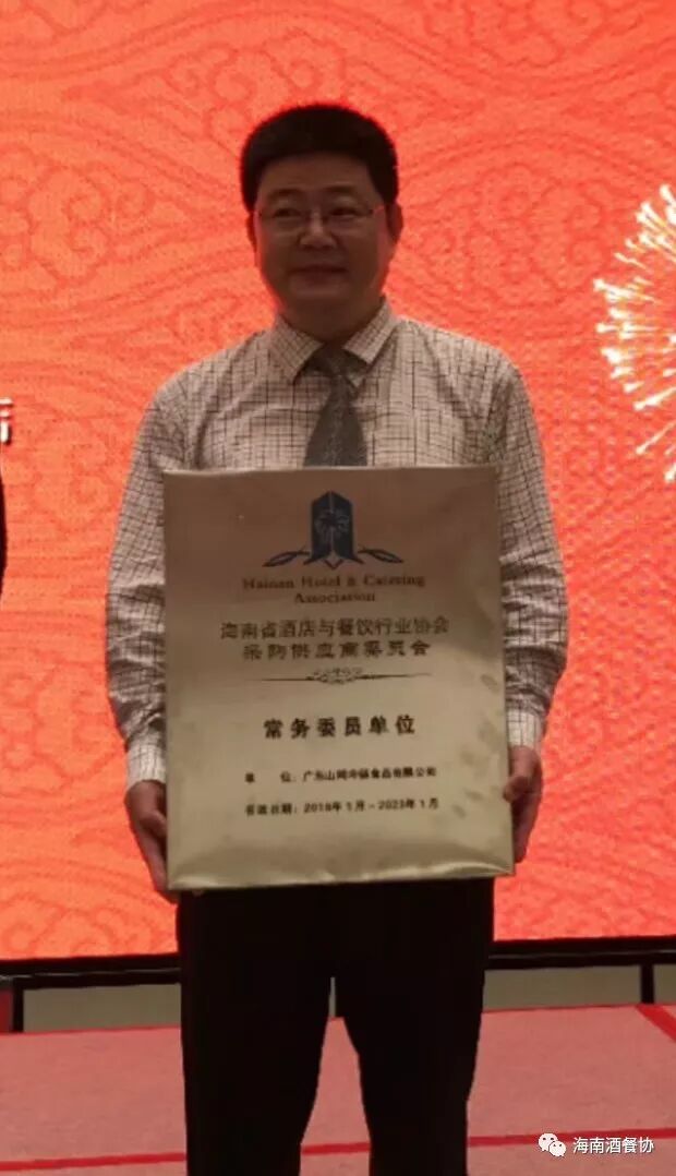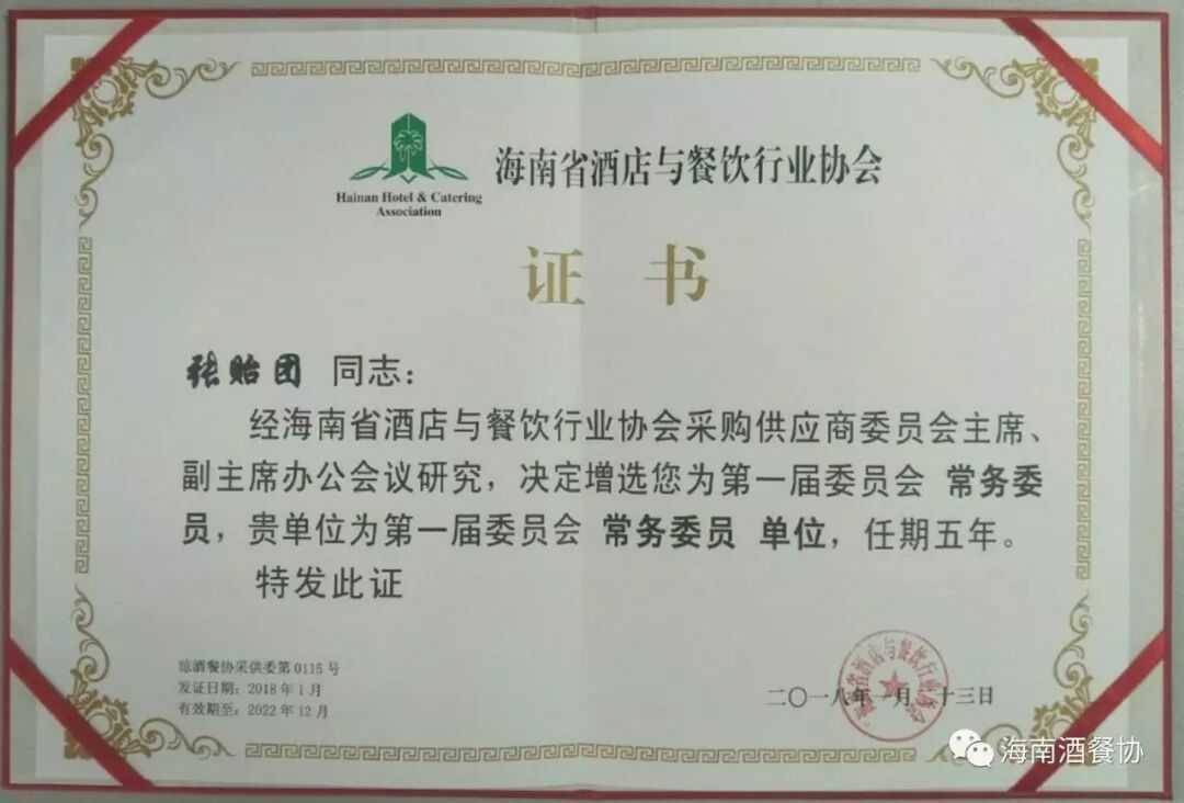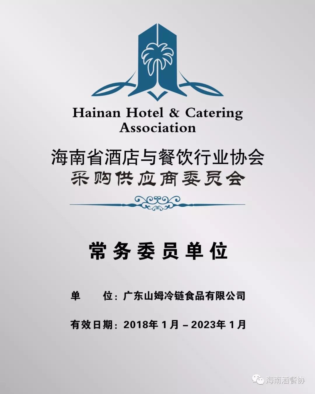 经海南省酒店与餐饮行业协会采购供应商委员会会议研究决定,增选广东山姆冷链食品有限公司为第一届采购供应商委员会常务委员单位,同时总裁张贻团先生被任命为委员会常务委员,并授予证书。
