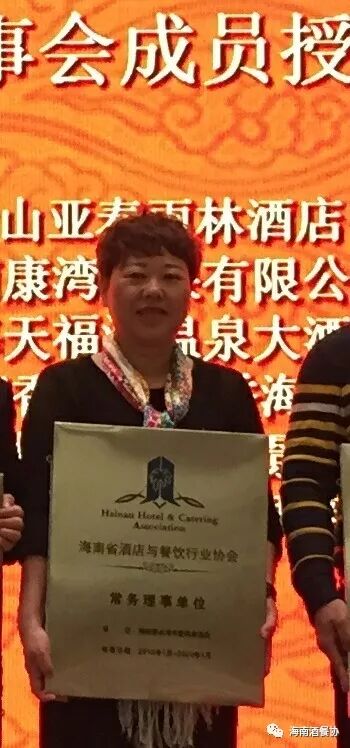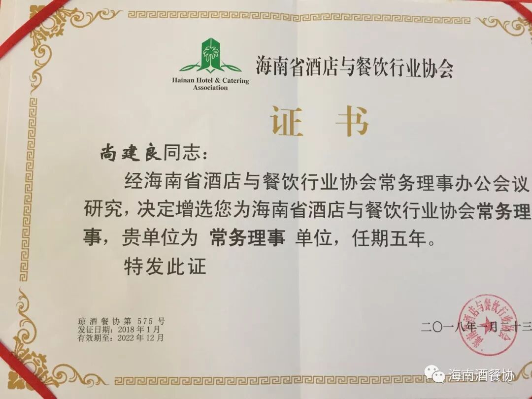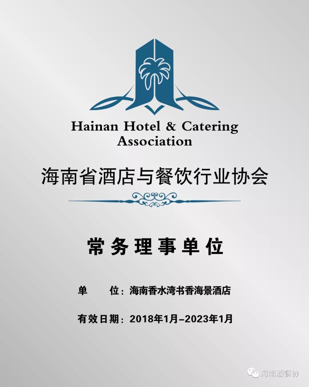 经海南省酒店与餐饮行业协会会议研究决定,增选海南香水湾书香海景酒店为第三届理事会常务理事单位,同时该单位总经理尚建良女士被任命为协会常务理事,并授予牌匾和证书。