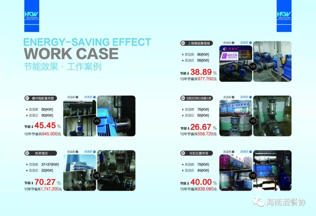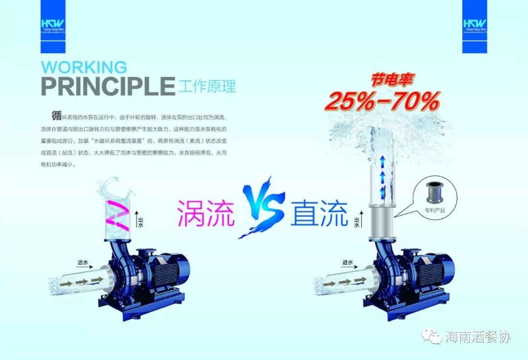 循环系统的水泵在运行中,由于叶轮的旋转,流体在泵的出口处均为涡流,流体在管道内按出口旋转方向与管壁摩擦产生较大阻力,这种阻力是水泵耗电的重要组成部分。加装“水循环系统整流装置”后,将原有涡流(紊流)状态改变成直流(层流)状态,大大降低了流体与管壁的摩擦阻力,水泵扬程降低,从而电机功率减小。降低水泵使用功率,达到节能的目的。