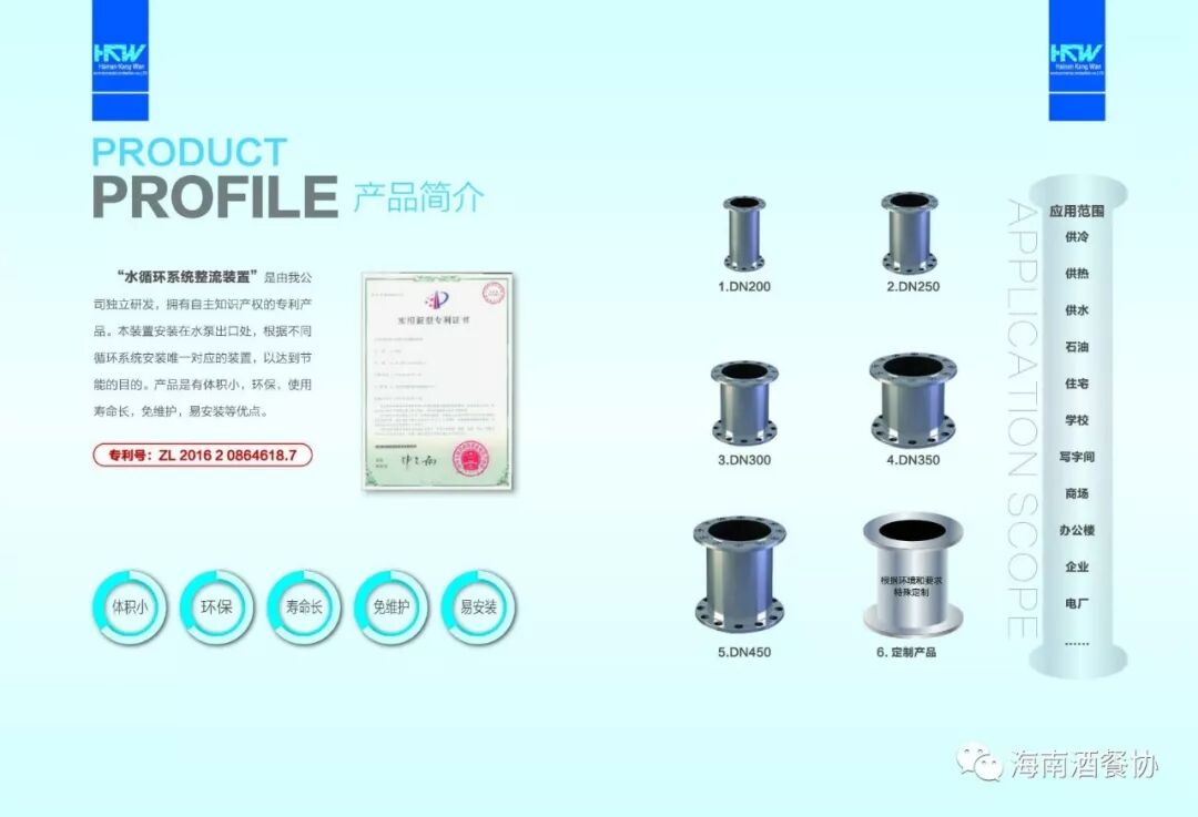 “水循环系统整流装置”是由我公司独立研发,拥有自主知识产权的国家专利产品。主要用于中央空调水循环系统水泵节能改造,安装于水泵出口处,根据不同循环系统安装唯一对应的装置,以达到节能的目的。它具有体积小,使用寿命长,免维护,易安装等优点。
