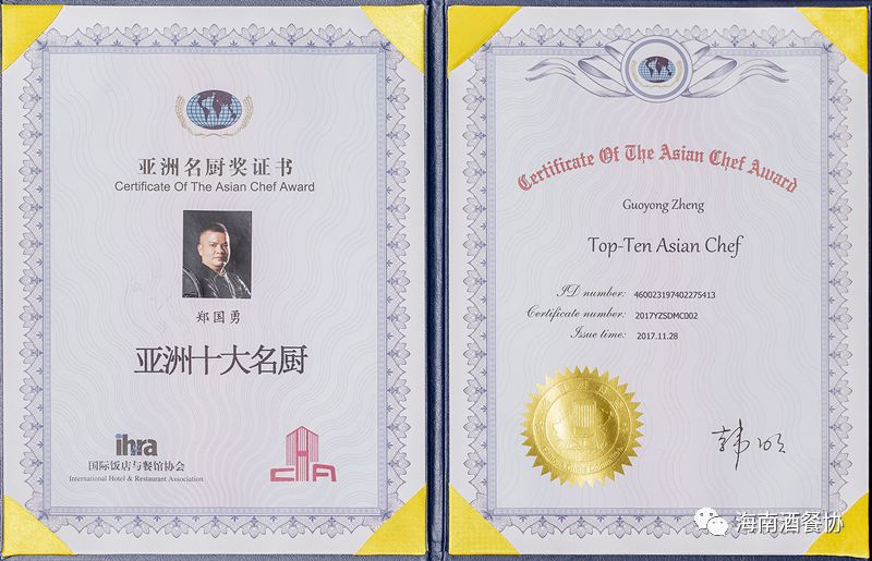 2017年11月27日,经海南省人民政府批准,由国际饭店与餐馆协会、海口市人民政府支持,中国饭店协会、海南省商务厅联合主办,海南省酒店与餐饮行业协会承办的“第二届中国国际饭店业大会暨海南特色美食文化节”在海口隆重举办。11月28日上午在海口鲁能希尔顿举办了大会重点活动之一“第二届亚洲名厨大会暨亚洲名厨殿堂奖盛典活动”。经海南省酒店与餐饮行业协会推荐,由国际饭店与餐馆协会和中国饭店协会评审,郑国勇同志荣获“亚洲十大名厨”荣誉称号,这是我省第二届唯一获得此殊荣的烹饪大师!