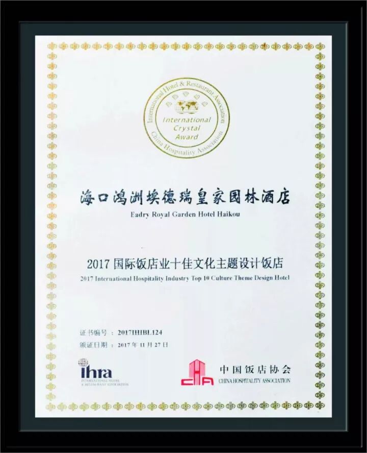 海口鸿洲埃德瑞皇家园林酒店荣幸受邀参与,在此会议中荣膺“五叶级中国绿色饭店”和“2017国际饭店业十佳文化主题设计饭店”奖。