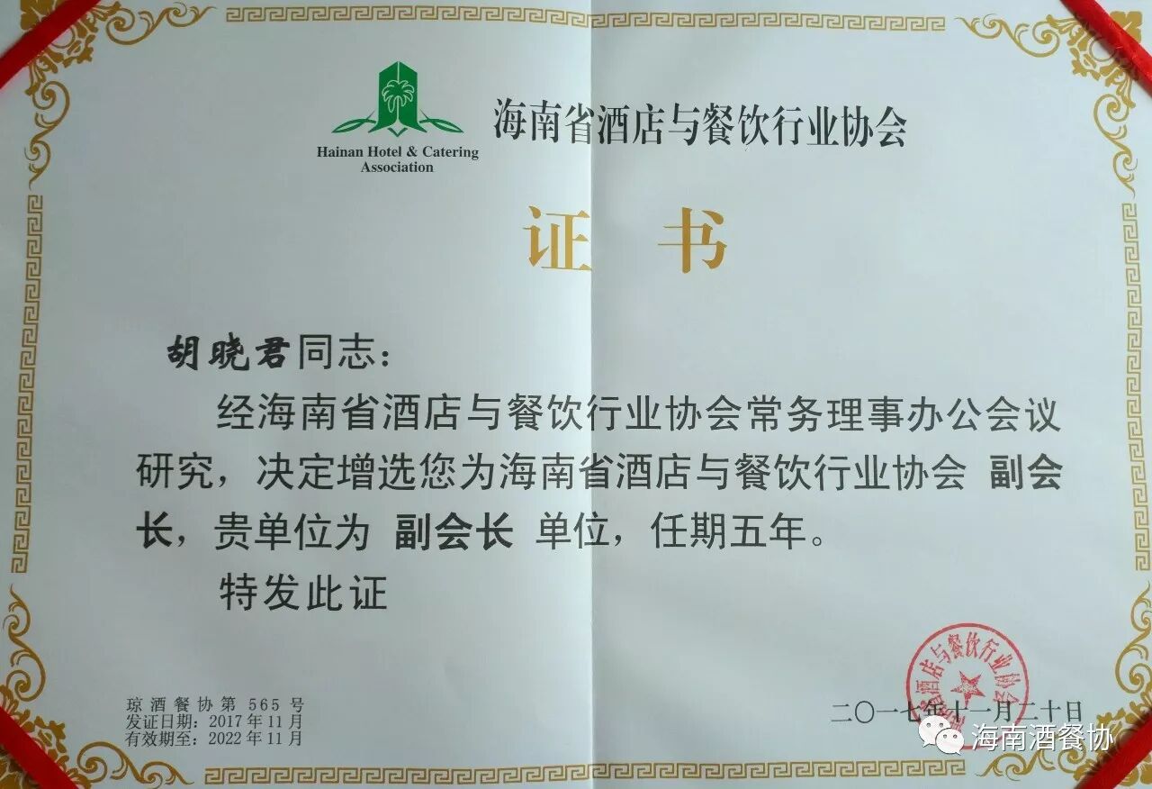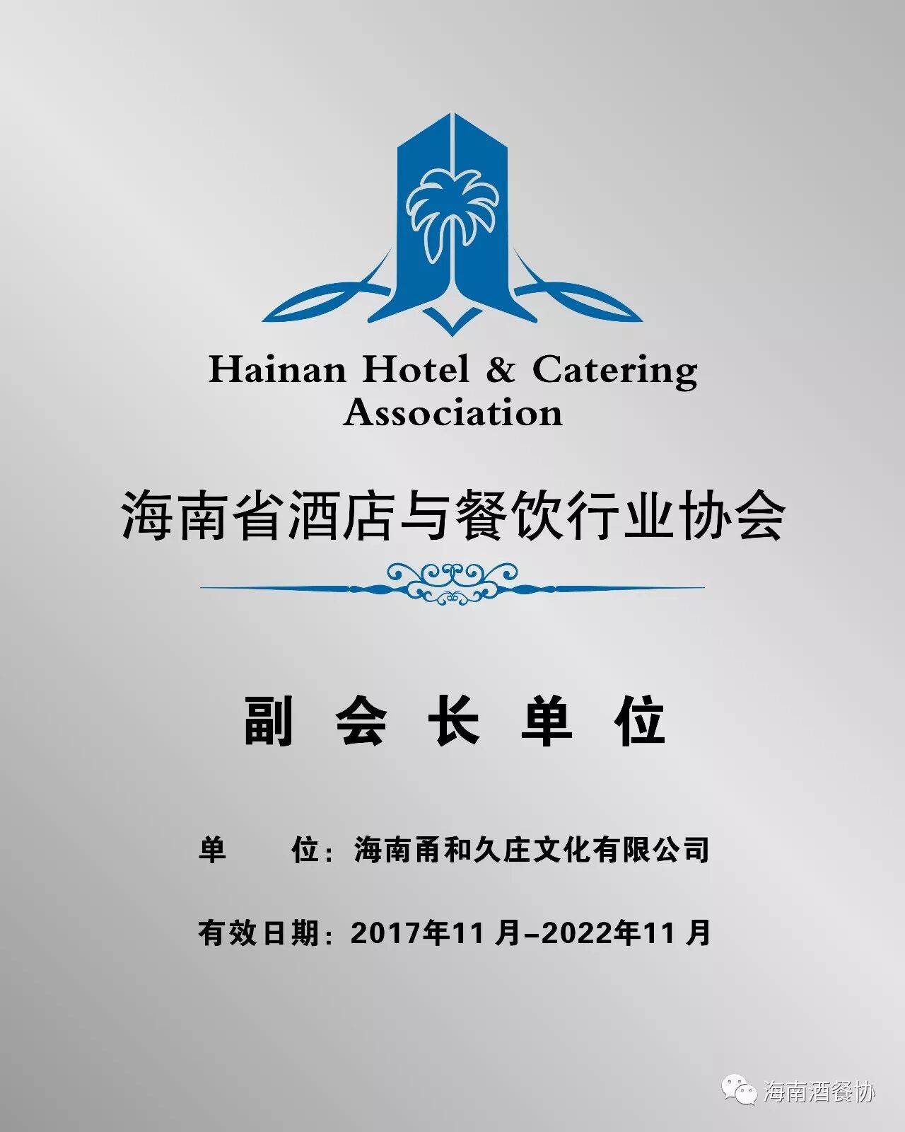 经海南省酒店与餐饮行业协会会议研究决定,将海南甬和久庄文化有限公司增选为第三届理事会副会长单位,同时董事长胡晓君先生被任命协会副会长,并授予证书。