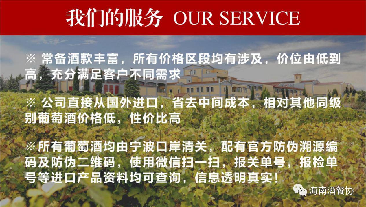 公司致力于葡萄酒文化的传承与推广,引导大家了解、感受真正的葡萄酒文化,转变国内对葡萄酒的传统认识与误解。致力于为大中小型企业单位服务,降低采购成本,提升酒类品质,并提供专业的,多方位的售后服务!