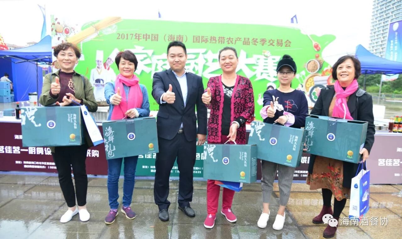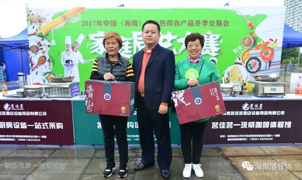 省酒店与餐饮行业协会副会长兼秘书长陈刚、海南翔太渔业股份有限公司经理刘佑鸿为获得家庭组三等奖选手颁发奖品