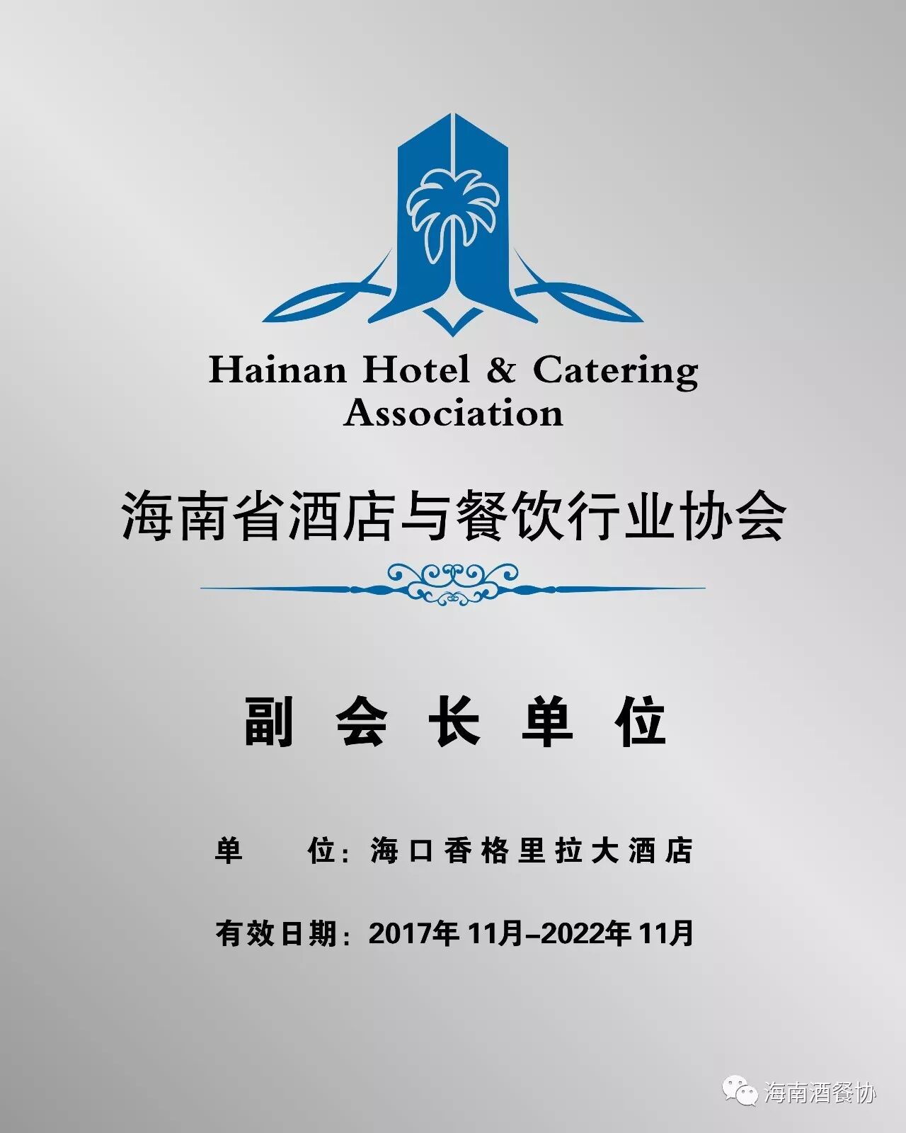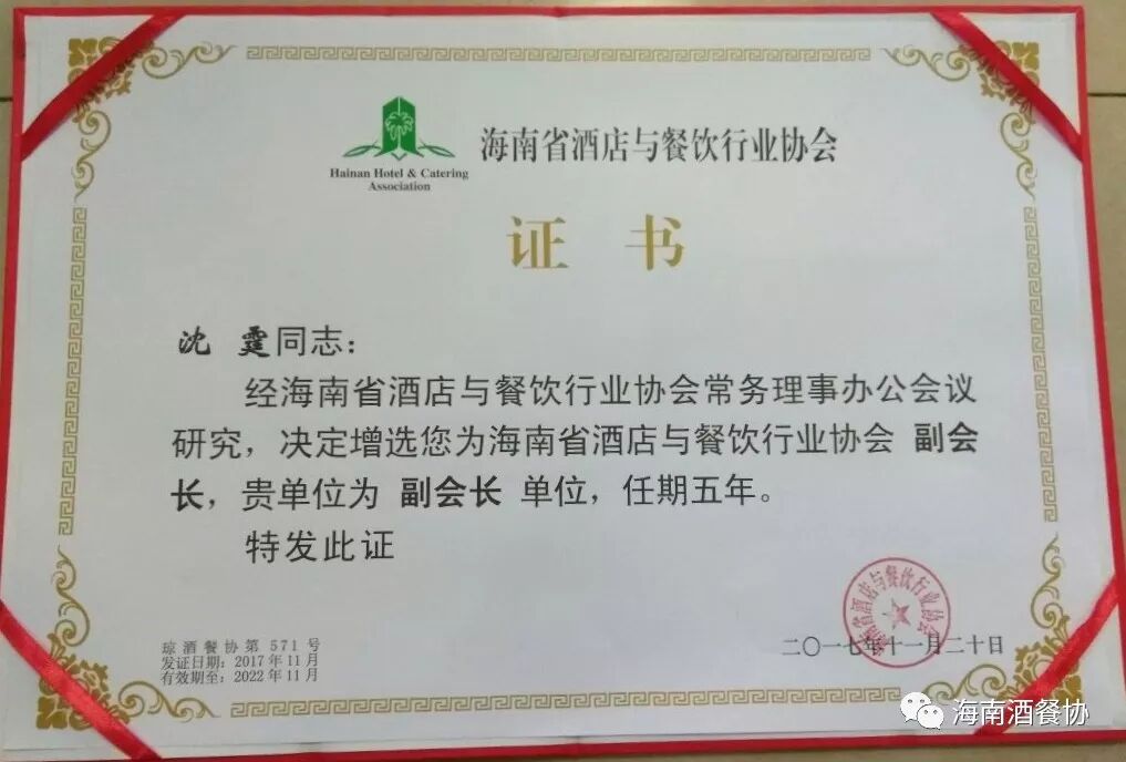 经海南省酒店与餐饮行业协会会议研究决定,将海口香格里拉大酒店增选为第三届理事会副会长单位,同时酒店总经理沈霆先生被任命协会副会长,并授予证书。