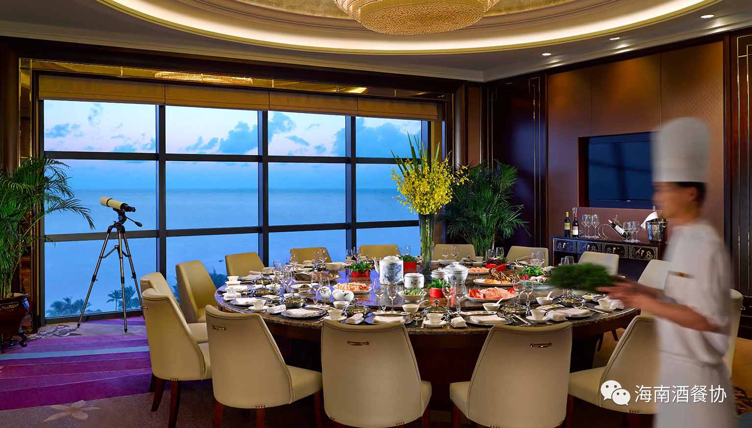 香宫另一间独立的包房-海甸厅,位于酒店主楼顶层(10楼),落地窗外即是酒店花园及海天一色景观,该厅提供各式风味火锅,可供16人同时用餐。