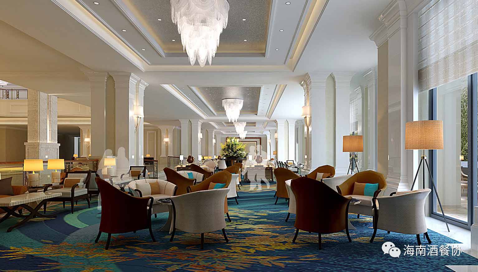 大堂酒廊位于酒店二层,蔚蓝色的订制地毯上浪潮澎湃,花园与海景相连,大堂桔黄色的麦穗与五盏依次排列的花蕊形水晶灯交相辉映。白色的大理石墙面沿袭了大堂的欧式风格,明亮的天花板与宽大的落地玻璃窗共同营造出开阔通透的空间感,大堂酒廊由此成为欣赏海上日落美景的最佳地点。