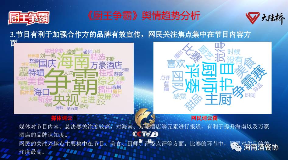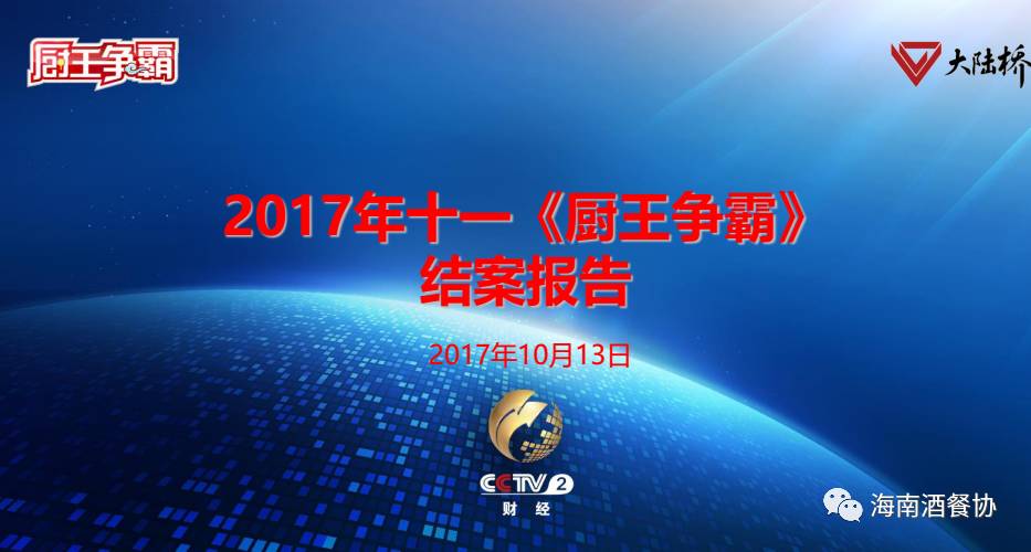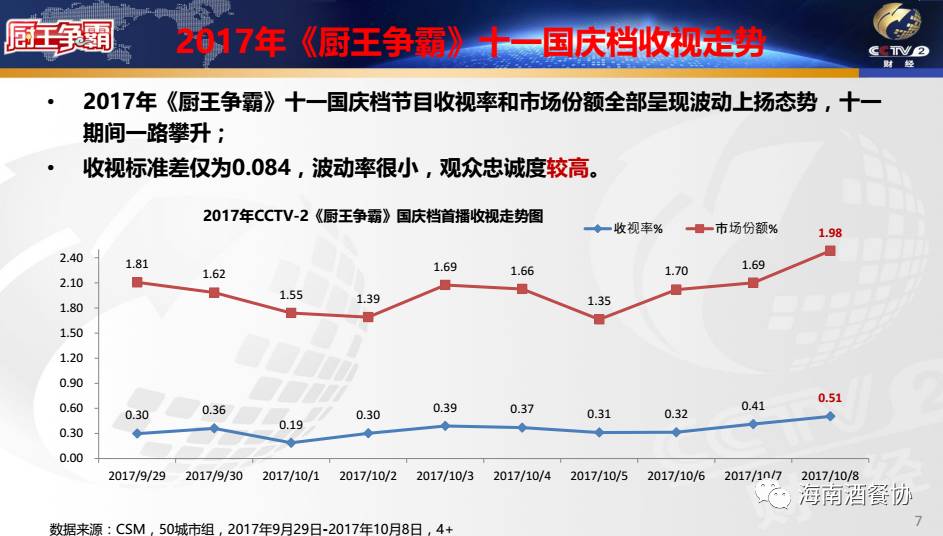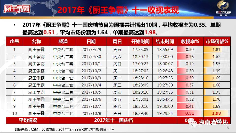 央视《厨王争霸》走进海南系列特辑于CCTV2十一国庆档黄金时段强势连播10集,收视大捷、好评不断,首播当日即斩获同时段央视各类频道美食类栏目第一宝座。据统计,作为央视二套《厨王争霸》栏目2017年国庆档期重磅推出的走进海南系列特辑,首播平均收视率即达0.35,单期(第十集)收视率最高达0.51,平均市场份额1.64,单期(第十集)市场份额最高达1.98,较央视其他各频道美食类栏目同期相比,所占市场份额最大、收视率最高。在央视、网络、APP等多媒体的立体传播下,厨王争霸走进海南特辑可谓收视大捷,深得全国广大观众的一致喜爱。截至目前,《厨王争霸》走进海南系列特辑首播、重播等电视媒介累计近1.1亿人次观看,中国网络电视台、优酷土豆网、新浪微博、微信公众号等网络媒介累计获得近2.3亿次视频点击播放及互动,网络热门话题不断,人气持续高涨,深受社会主流人群喜爱。