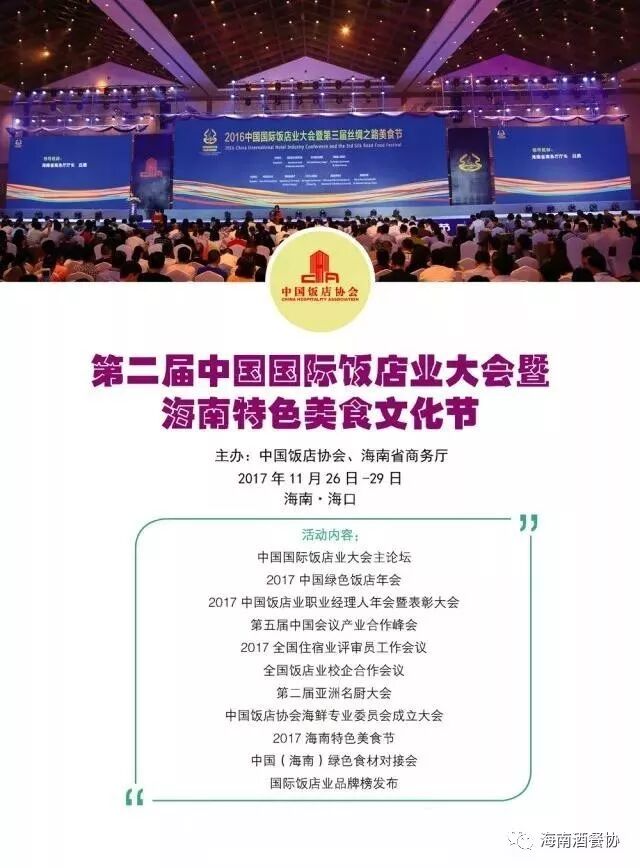 经海南省人民政府批准,由国际饭店与餐馆协会和海口市人民政府支持,中国饭店协会、海南省商务厅主办,省酒店与餐饮行业协会承办的“第二届中国国际饭店业大会暨海南特色美食文化节”将于2017年11月26日—29日在海南海口举办。大会期间将举办“2017全国饭店业优秀职业经理人表彰活动”。受中国饭店协会委托,海南省酒店与餐饮行业协会负责海南省饭店和职业经理人的推荐和初审工作,现将有关事宜通知如下: