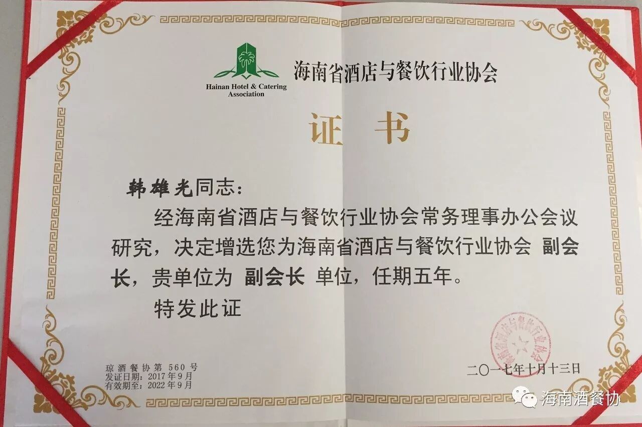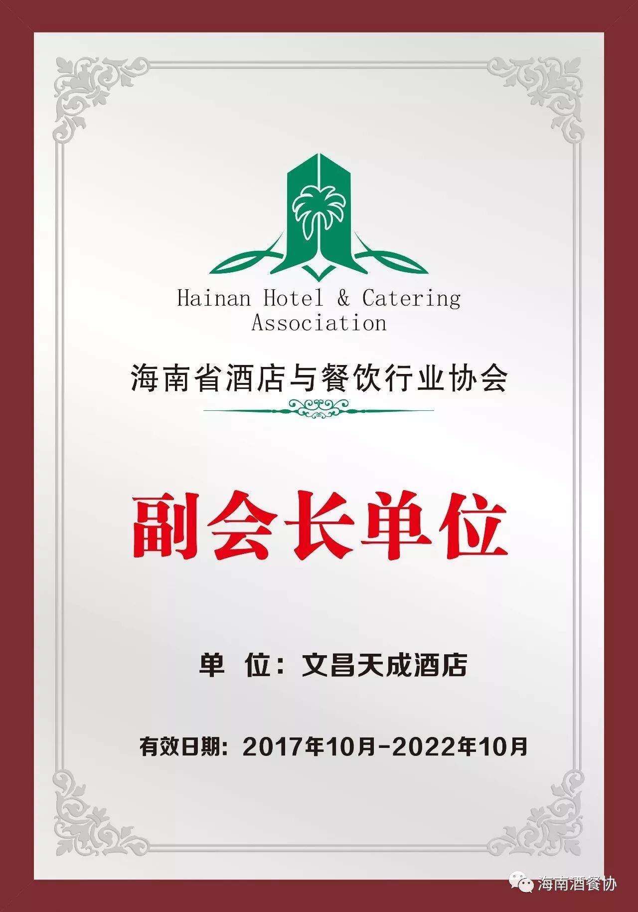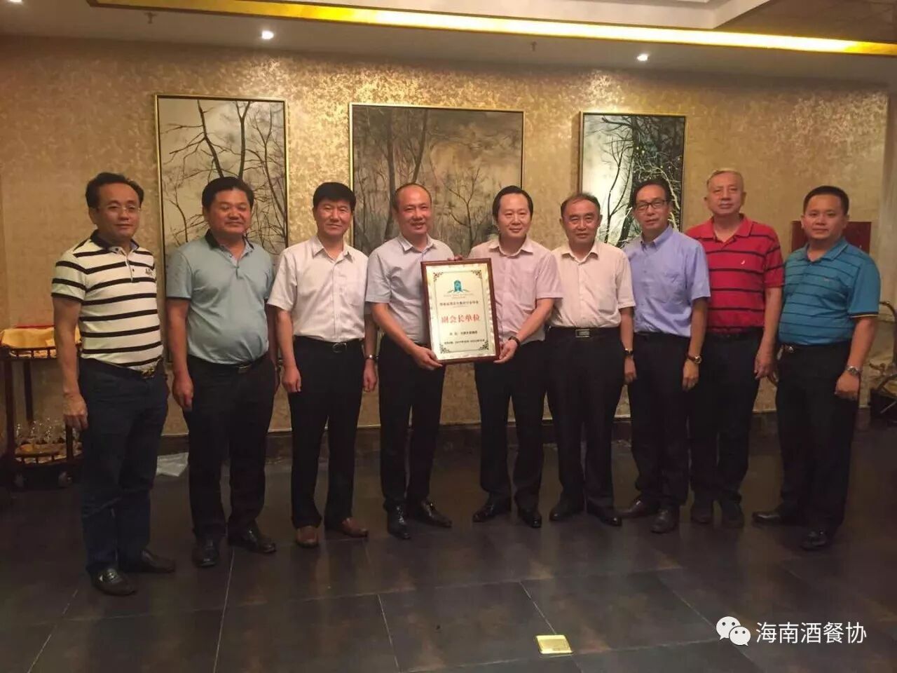 中国饭店协会副监事长、海南省酒店与餐饮行业协会执行会长陈恒(右)为海南天成集团董事长韩雄光先生(左)颁发副会长单位牌匾。山西省政协副主席、中国饭店协会副会长王宁、中国饭店协会专职副会长张景富、知名经济学家胡卫东、文昌市副市长符策万、文昌市商务局局长陈忠勇等见证颁牌!