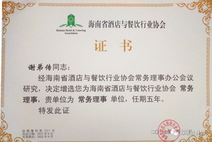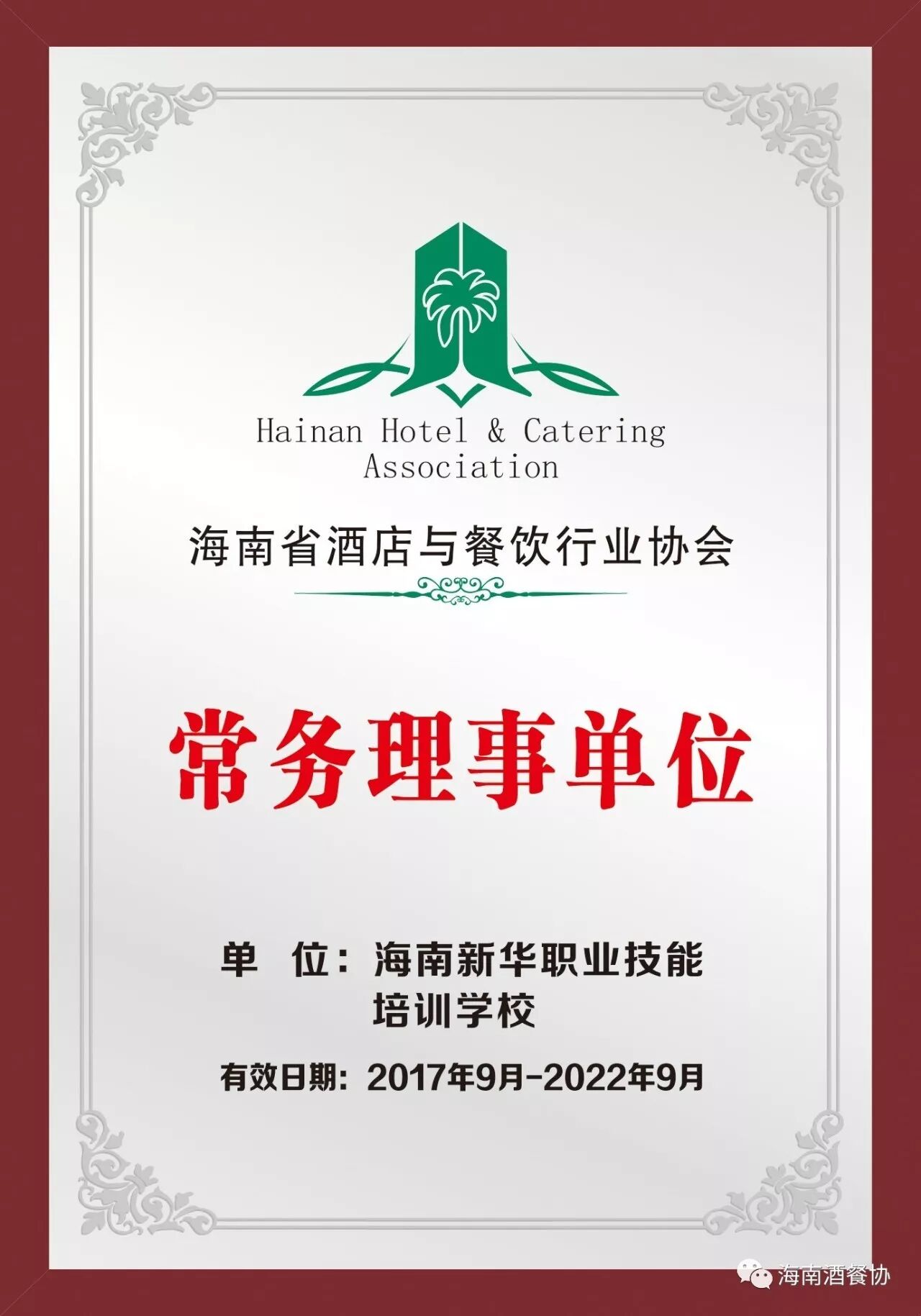经海南省酒店与餐饮行业协会常务理事办公会议研究,决定增选海南新华职业技能培训学校为海南省酒店与餐饮行业协会常务理事单位,同时该学校的校长谢弟传先生被任命协会的常务理事,并授予证书。