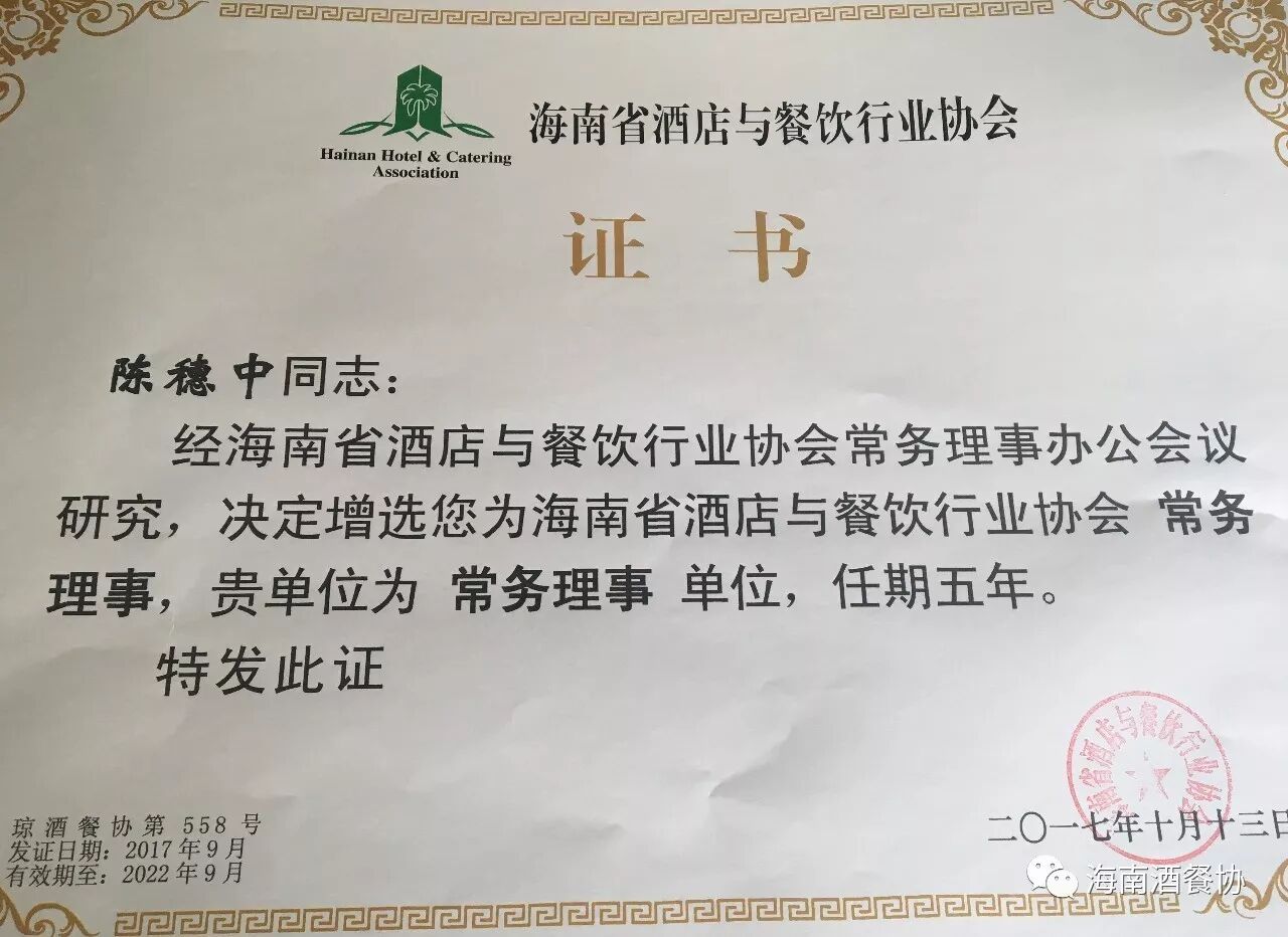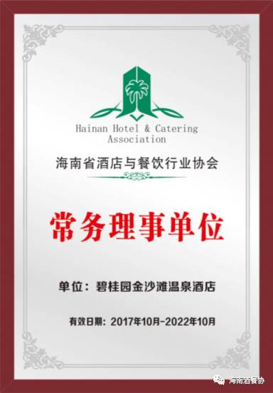 经海南省酒店与餐饮行业协会常务理事办公会议研究,决定增选海南碧桂园金沙滩温泉酒店为海南省酒店与餐饮行业协会常务理事单位,同时酒店总经理陈穗中先生被任命协会的常务理事,并授予证书。