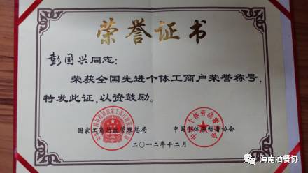 2012年12月荣获“全国先进个体工商户”(成为海南省唯一家获此荣誉的个人)