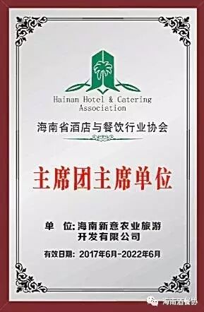 2017年6月9日,经海南省酒店与餐饮行业协会常务理事办公会议研究,决定增选海南新意农业旅游开发有限公司为海南省酒店与餐饮行业协会主席团主席单位,同时该公司的总经理吕庆臣先生被任命协会的主席团主席,并授予证书。