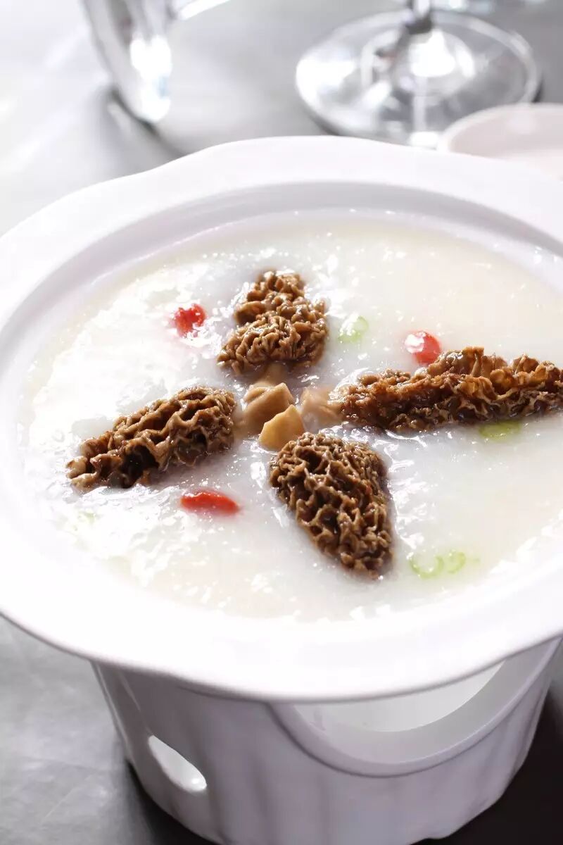 3、将高汤放入锅内烧开,放入淮山泥煮熟调味,后放入羊肚菌一起烩,然后放入香芹、枸杞出锅装盘即可。