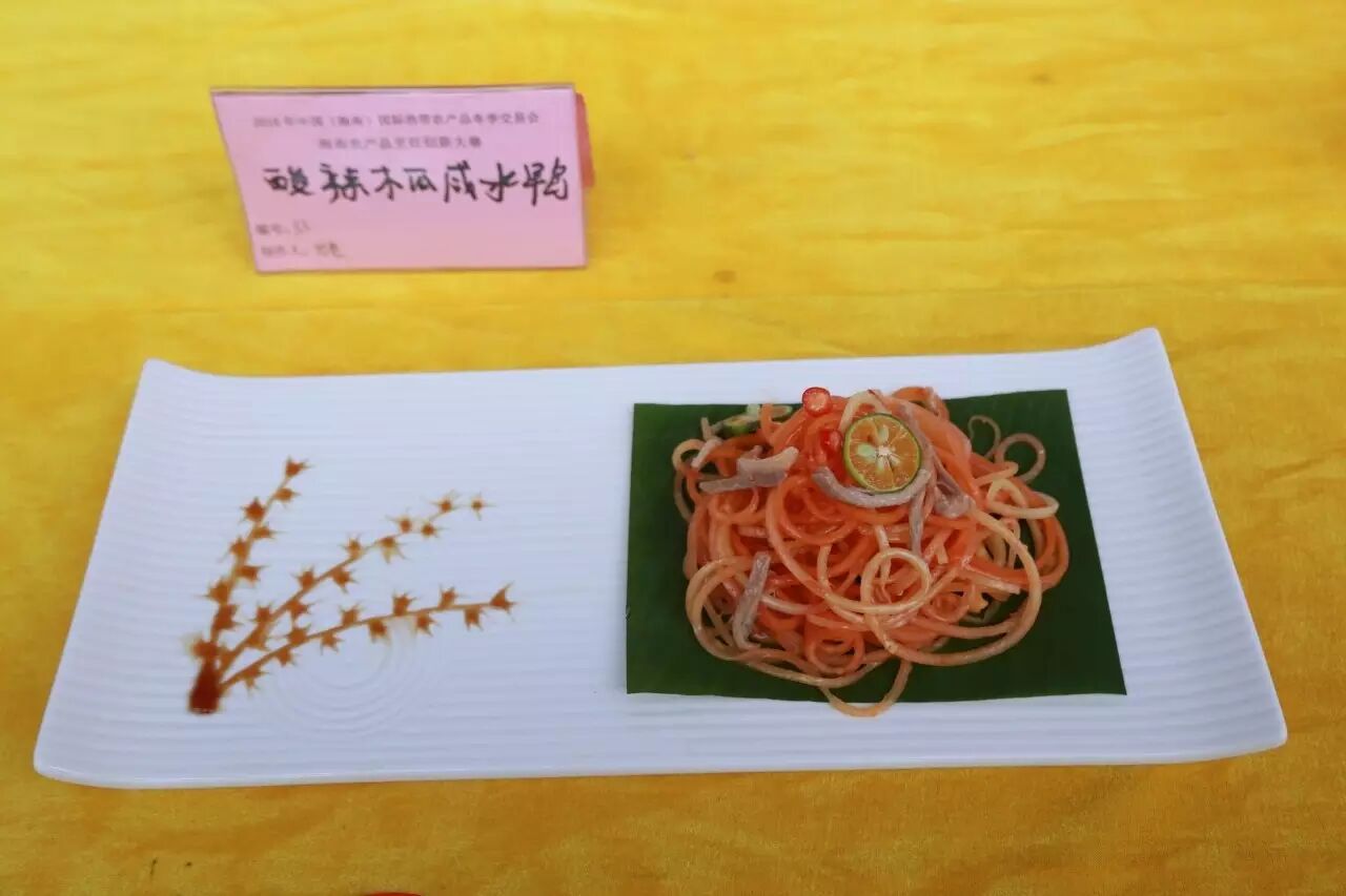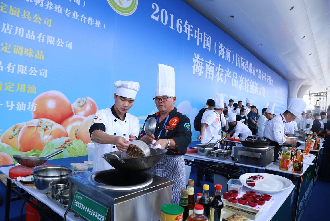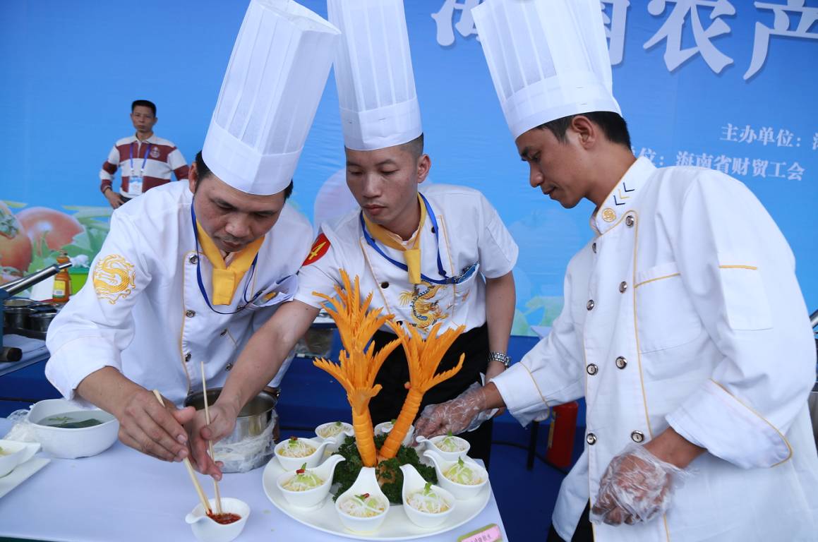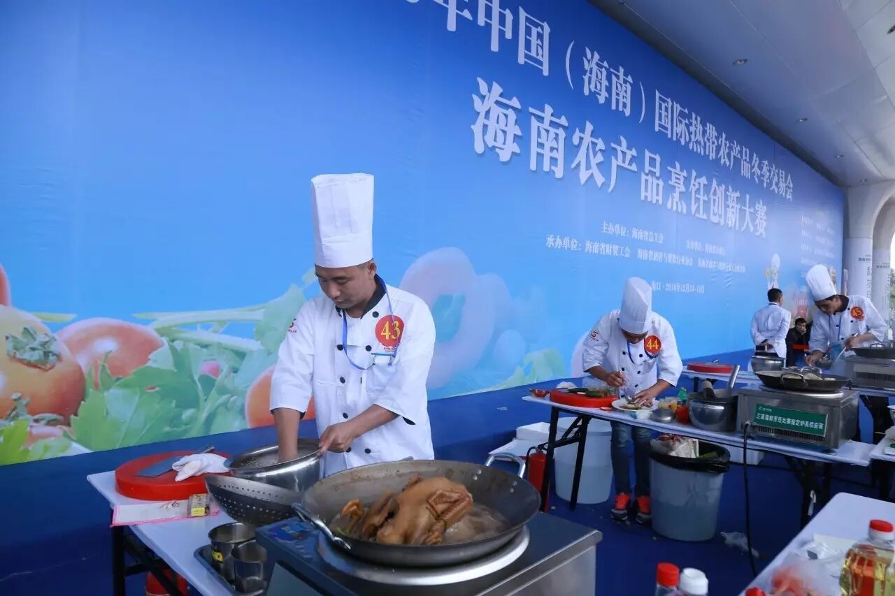 12月13-14日,作为今年冬交会重点活动之一的海南农产品烹饪创新大赛旗鼓上演。省财贸工会主席吕亚平主持开幕式,省人大常委会副主任、省总工会主席陈海波,省总工会副主席郑有基,省农业厅总农艺师黄正恩,省人大常委会原秘书长、省绿色饭店工作委员会主任翟培基,省人社厅副巡视员龙小敏,省就业局副巡视员李少山,省商务厅调研员林保松,省酒店与餐饮行业协会执行会长、省酒店与餐饮行业工会联合会主席陈恒,省烹饪协会会长陈建胜出席并为开幕式剪彩,海口市餐饮烹饪协会会长林壮森、儋州市餐饮烹饪协会会长侯群英、万宁市烹饪餐饮行业协会会长刘海涛等市县相关协会负责人及省酒店餐饮行业协会主席团主席、副会长和省内酒店餐饮企业负责人、参展企业、参赛选手及媒体代表300余人参会,主办、承办、协办单位的领导到场观摩,特邀嘉宾评委唐人志、李学深、庄裕伦、吴日辉、史李生等五位中国烹饪大师为大赛作现场点评。来自海口、三亚、文昌、琼海、儋州、定安、屯昌、万宁等市县的厨师骨干分别组成资深组和青年组进行比赛。通过两天的精彩PK,他们的精湛厨艺让在场的观众们亲身体验了美食烹饪的艺术和魅力。